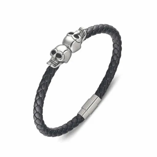 Blaze Stainless Steel Men’S Black Leather Bangle With Double Skulls And Shiny Clasp In Steel