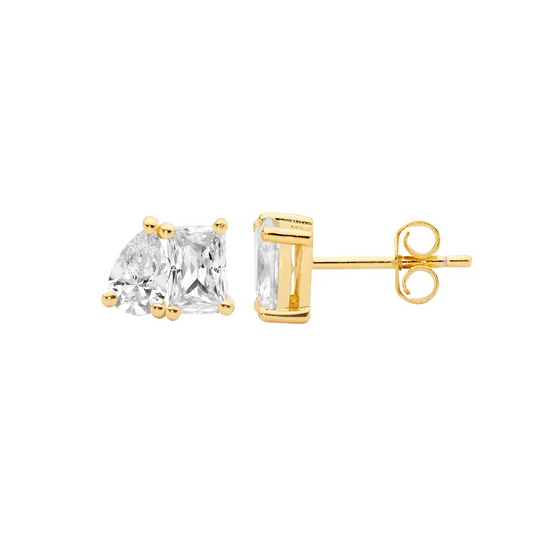 Ellani SS Emerald & Pear Cut Wh CZ Stud Earrings W/Gold Plating