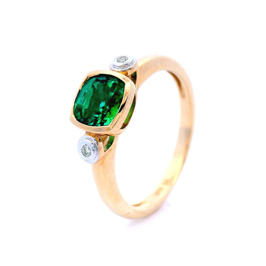 Synthetic Emerald Cushion_White Diamond D4-SI3 JKL Coloured Stone Ring in 9ct Yellow Gold 1=0.87ct 2=0.03ct...