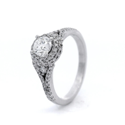 Diamond and Diamond Halo Engagement Ring featuring a 0.50 Carat Round Brilliant Cut Centre and...