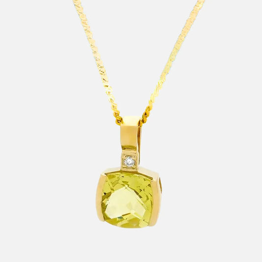 9ct Gold Lemon Quartz Cushion 3/4 Bezel with 1X Diamond Pave Set Pendant