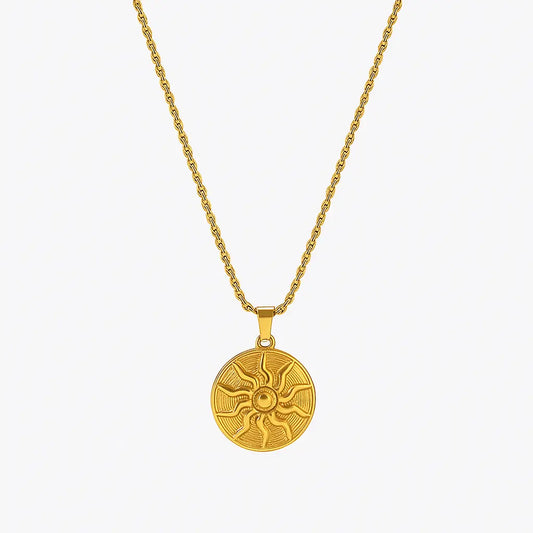 This bold pendant necklace is expertly crafted from high-quality metal, featuring a circular medallion with...