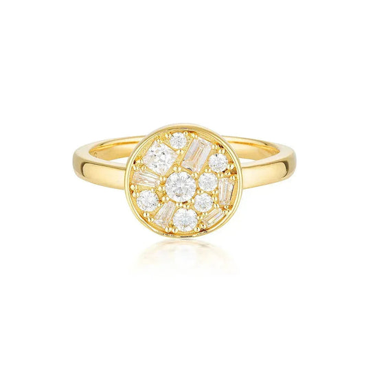 The Mosaic gold ring features an intricate collage of shapes, delicately arranged and designed to...