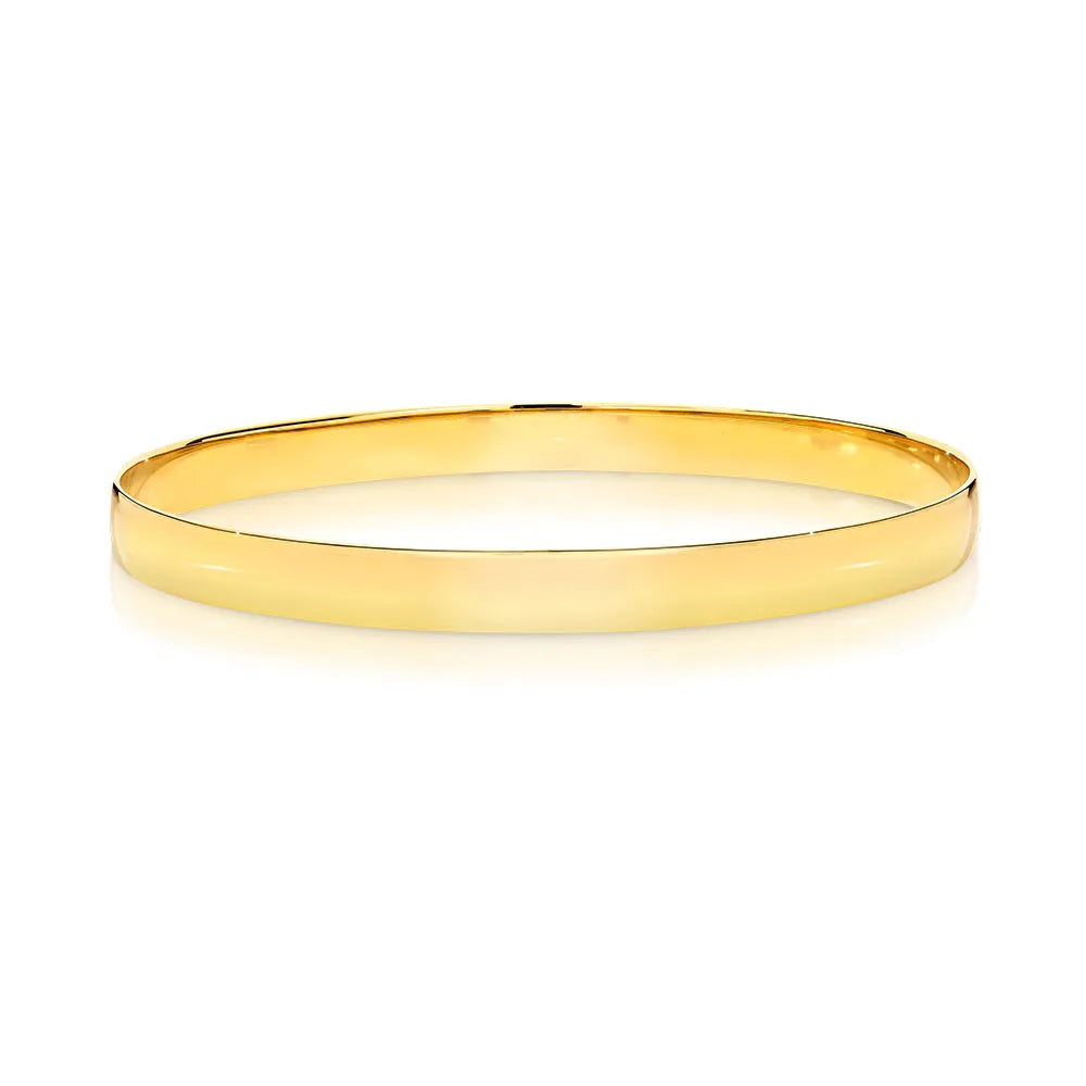 Solid bangle, half round profile. Approx. 1.1mm thick, 9ct approx weight 13.5gms, 65mm diameter