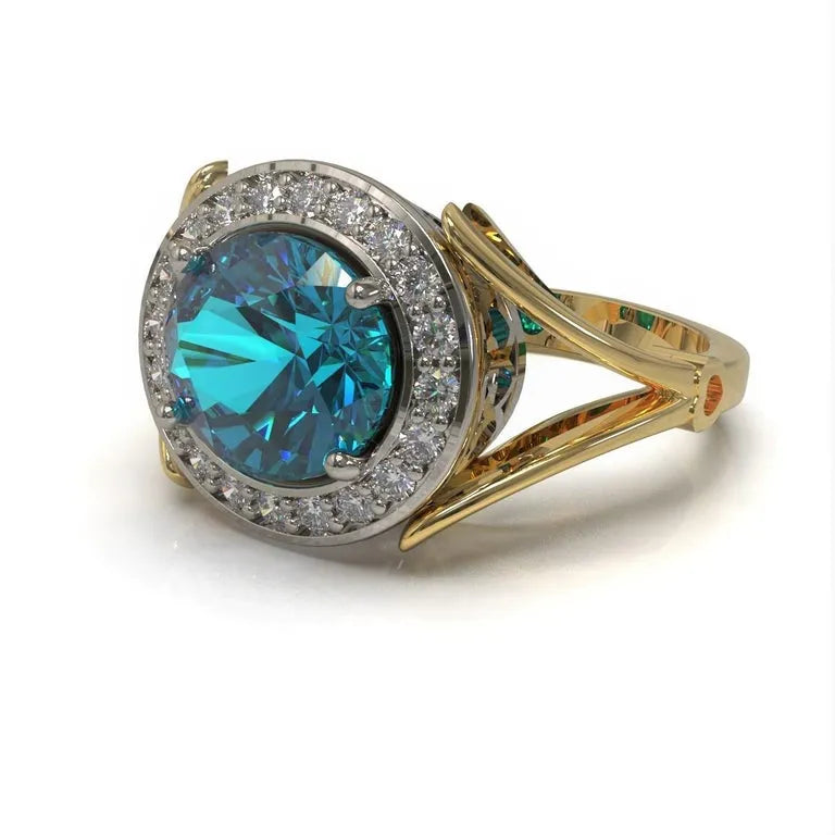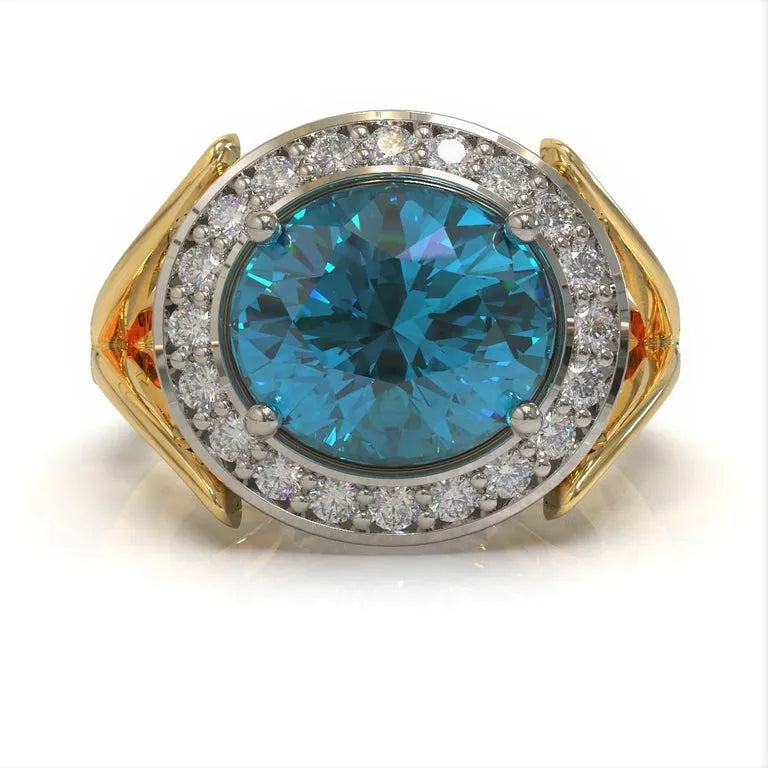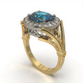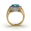 Art Deco style, this elegant ring is made in platinum and 18 carat yellow gold, set with a stunning oval cut natural Burmese Apatite and round brilliant cut diamonds.