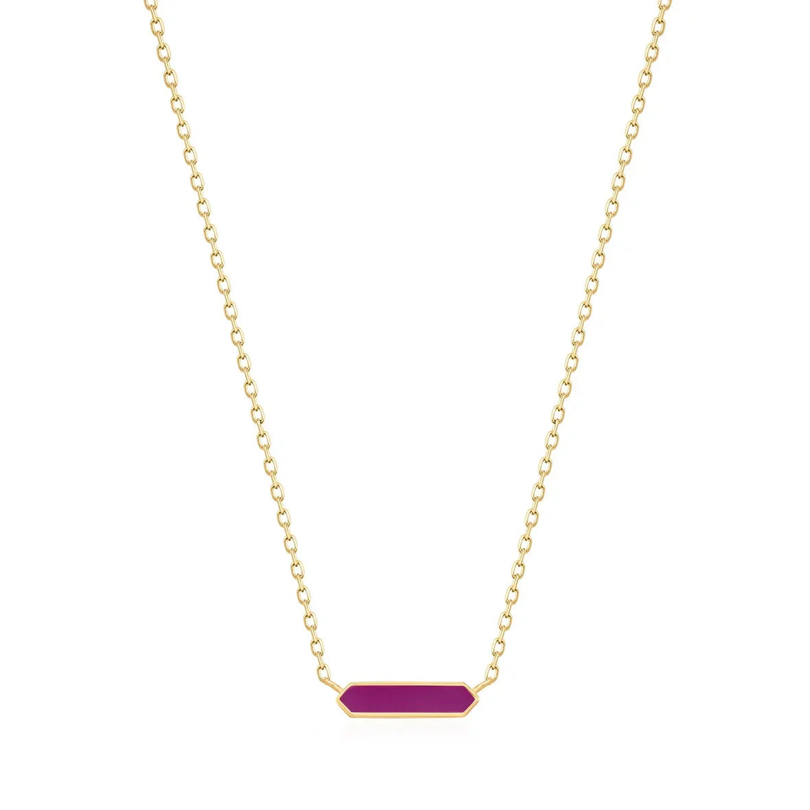 Balancing minimal style with a pop of bright colour, ease into everyday with this super chic gold bar necklace. Set on a simple and delicate chain, weve swopped a traditional pendant for a sleek bar, finished with a flash of the collections signature berry enamel coating. The perfect way to update any layered necklace look or let it standalone as your outfits striking colour-pop piece.