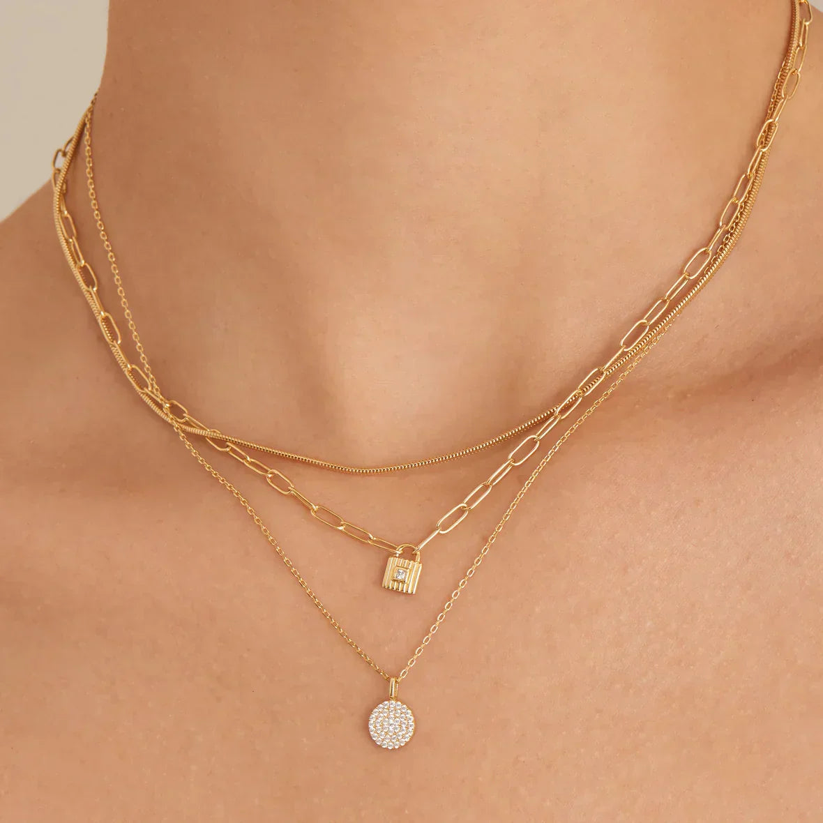 We’ve taken glam to the next level this season with our cubic zirconia necklace, complete with a sparkle encrusted disc pendant. Sitting on a classic delicate chain, the stunning round pendant is encircled with rows of shimmering stones. A statement piece on its own but also perfect to layer with your favourite delicate gold chains. Our Gold Glam Disc Pendant Necklace is also available in silver.
