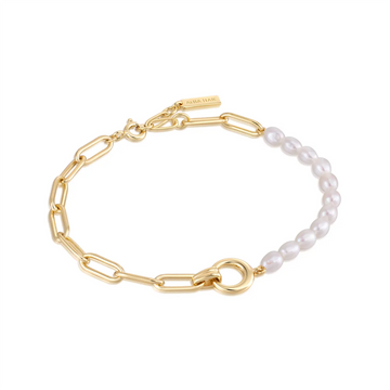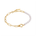 Get playful with trends this season with this chic pairing of chunky gold chains and a row of glistening pearls. This link bracelet is the perfect statement piece to add texture and style to your look in a bold and contemporary way. Style yours simply or stack with a contrasting dainty chain bracelet to complete your look.