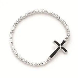 3mm Elastic Ball Bracelet with Black Onyx Cross Symbol in Sterling Silver