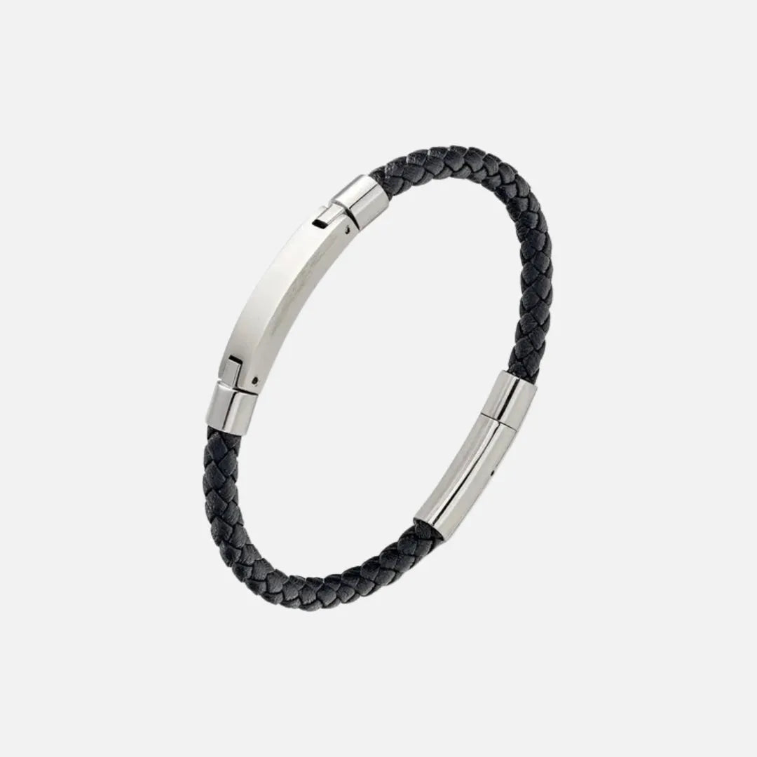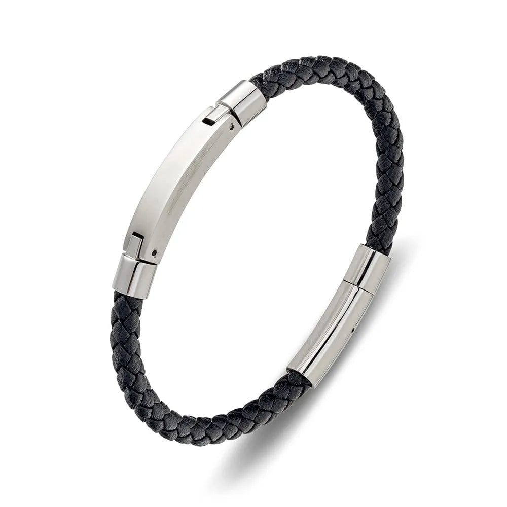 Blaze Stainless Steel Men’s Black Leather Bangle With Steel Bar