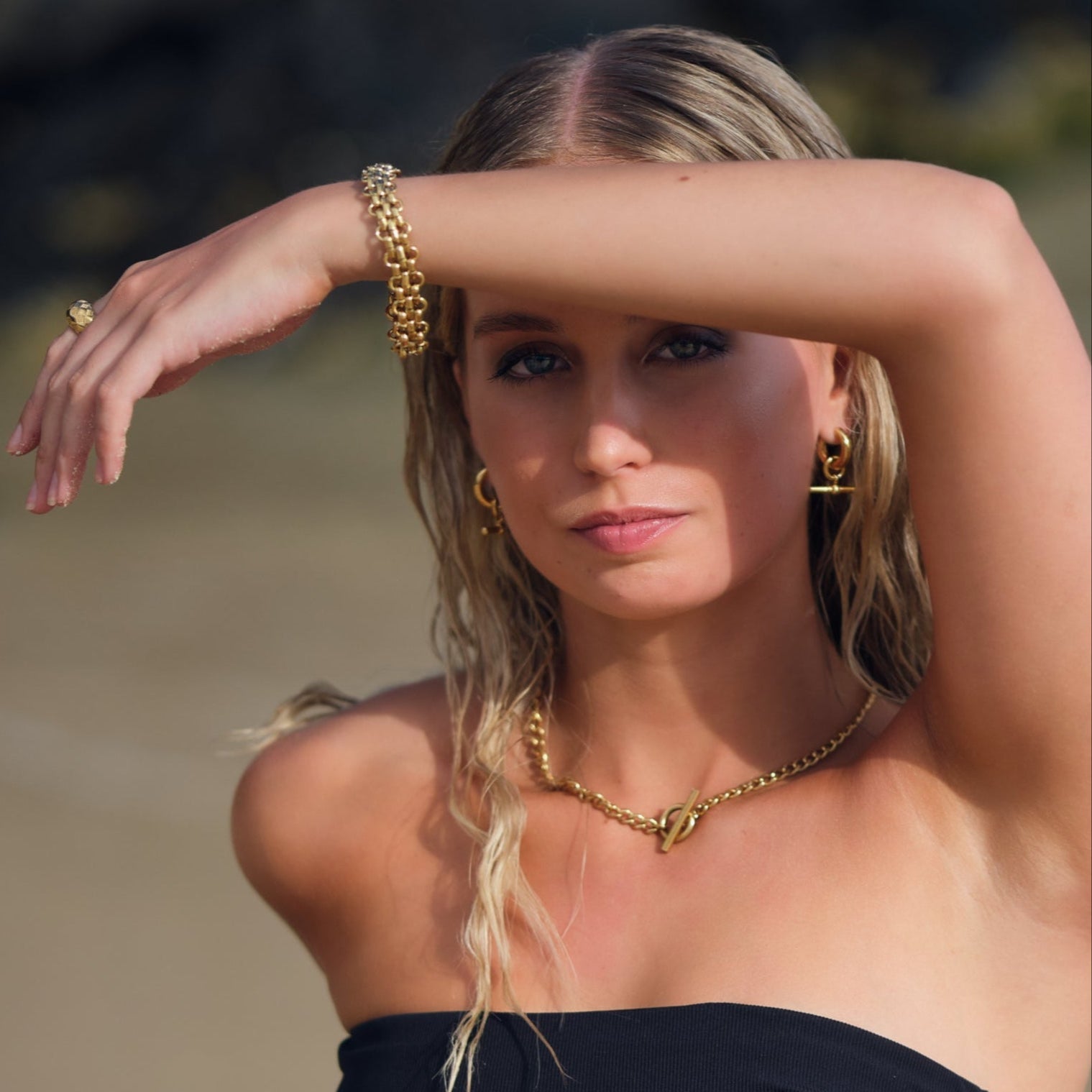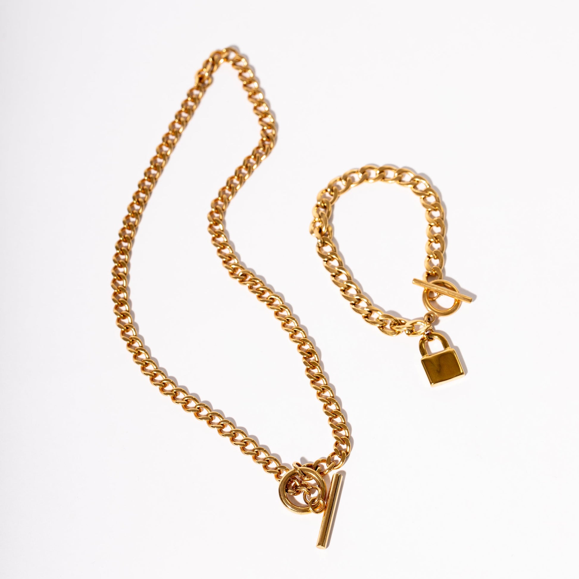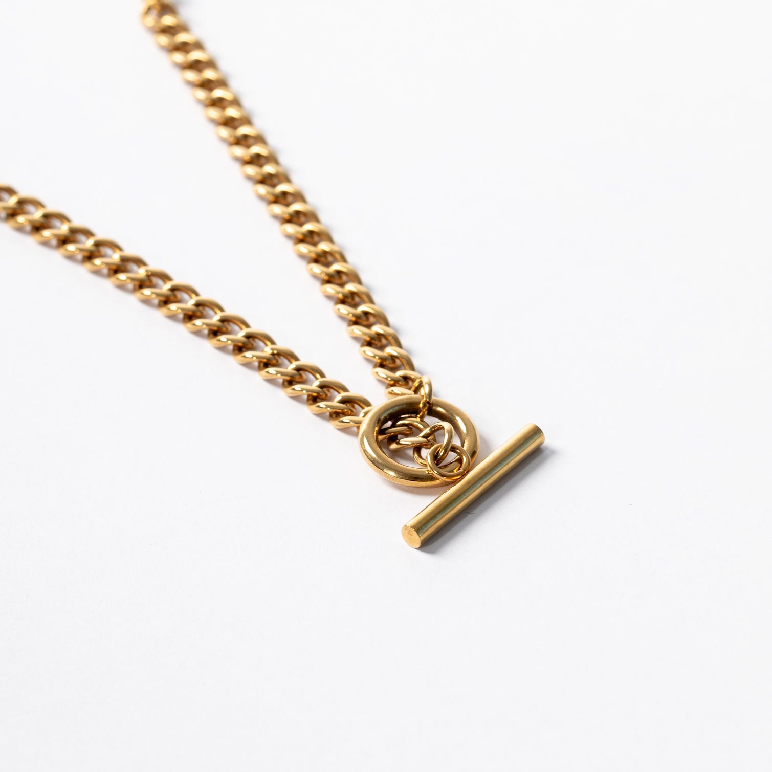 This thick, luxurious chain measures 42cm's in length and features a designer toggle closure that is both beautiful and secure. The chain itself is 5mm in width, featuring open weighty links. Styles like this sell for $10,000 and above in solid gold. Ours offers the same durability and permanent wear for a lot less. Waterproof, Tarnish Proof and Allergy Safe. A stunning forever piece.Â