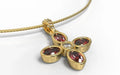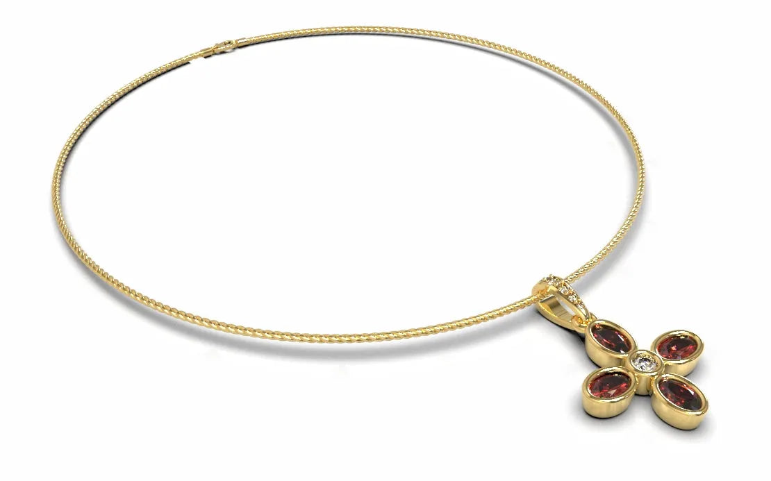 This eye-catching pendant made in 18 carat yellow gold. Four oval cut eye clean rubies set in the bezel setting surrounding a round brilliant cut diamond. The setting is suspended from a tapered, diamond pave' set bail through which an elegant cable chain is threaded.