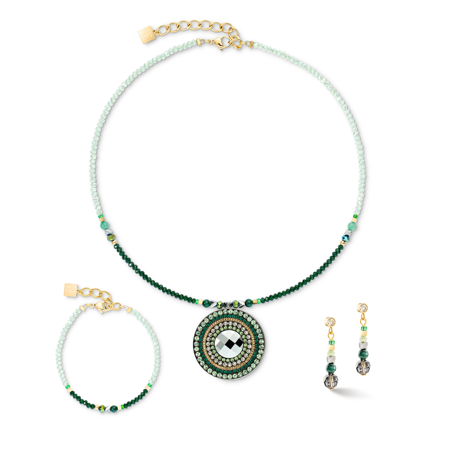 The Glamorous Green amulet necklace in gold is crafted from high-quality materials. The amulet is set with Swarovski® crystals, while the necklace features precious stones like malachite and green aventurine. This combination of sparkling crystals and precious stones makes for a unique piece of jewellery that is bound to turn heads