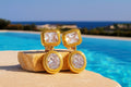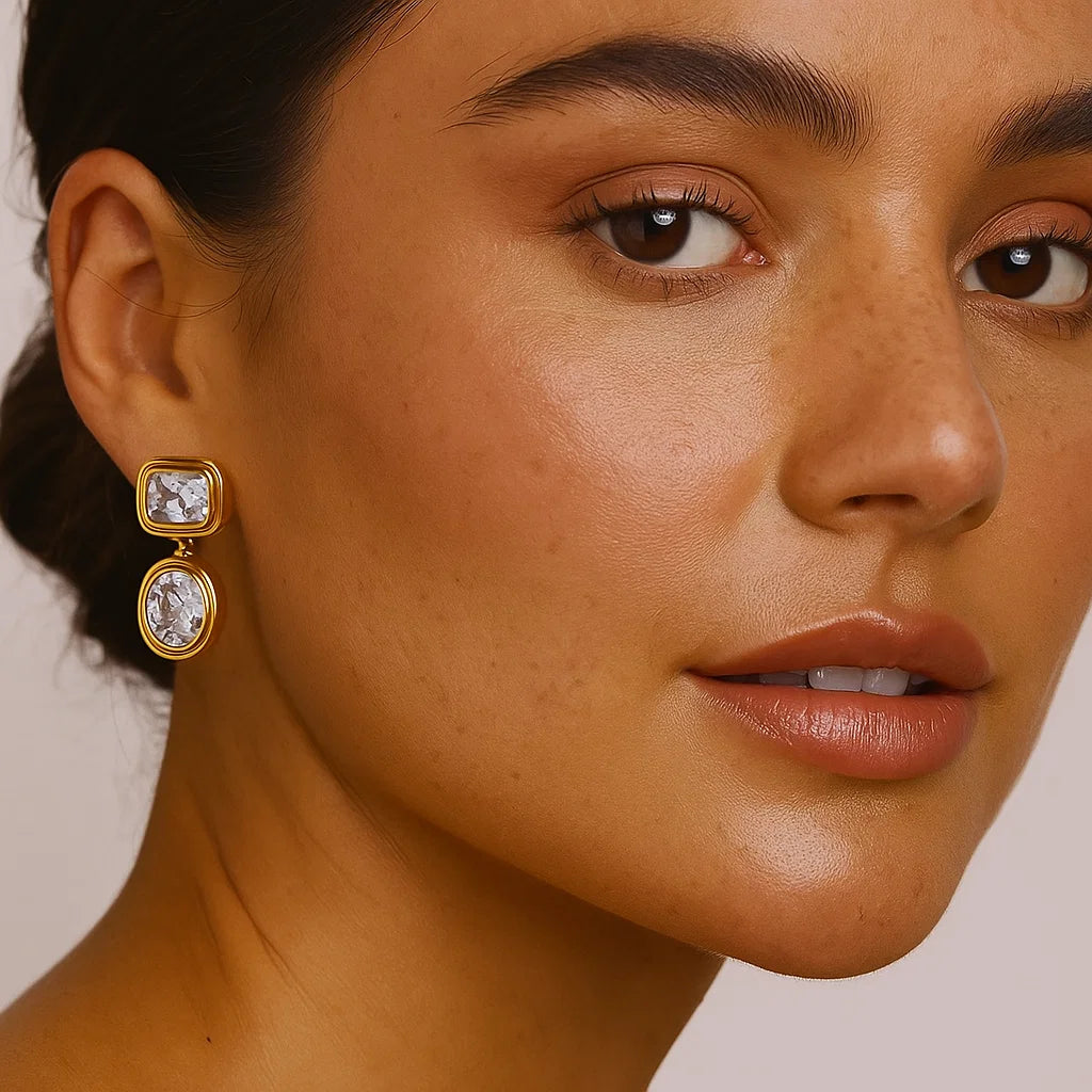 These elegant drop stud earrings are crafted from durable stainless steel and feature a sophisticated geometric design. The earrings consist of a square crystal atop a round one, both shimmering with a soft, captivating glow. Finished in gold for a touch of luxury, these earrings are hypoallergenic and waterproof, making them perfect for all-day wear. With a weight of 17.7g, they offer a bold yet comfortable look, ideal for both casual and formal occasions.