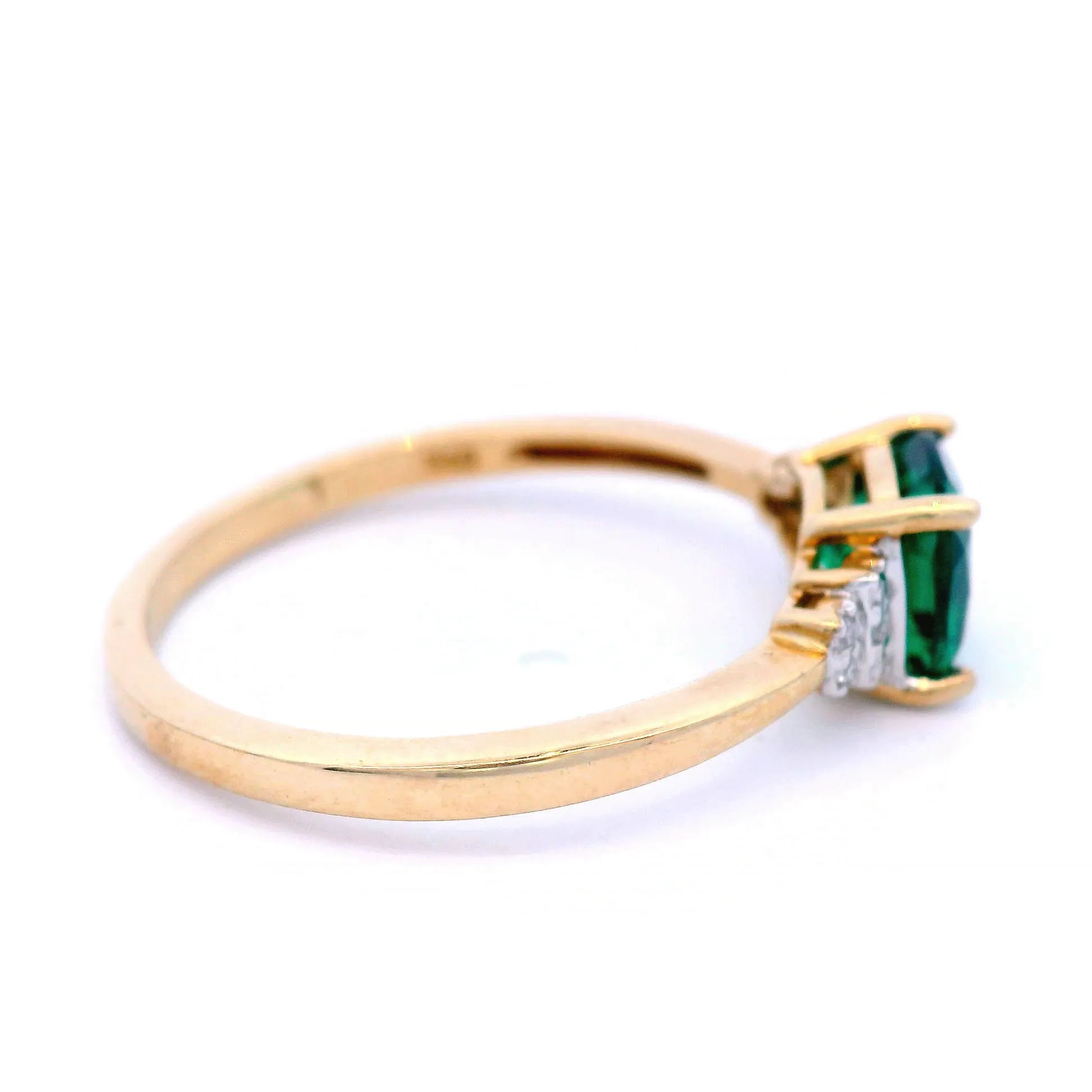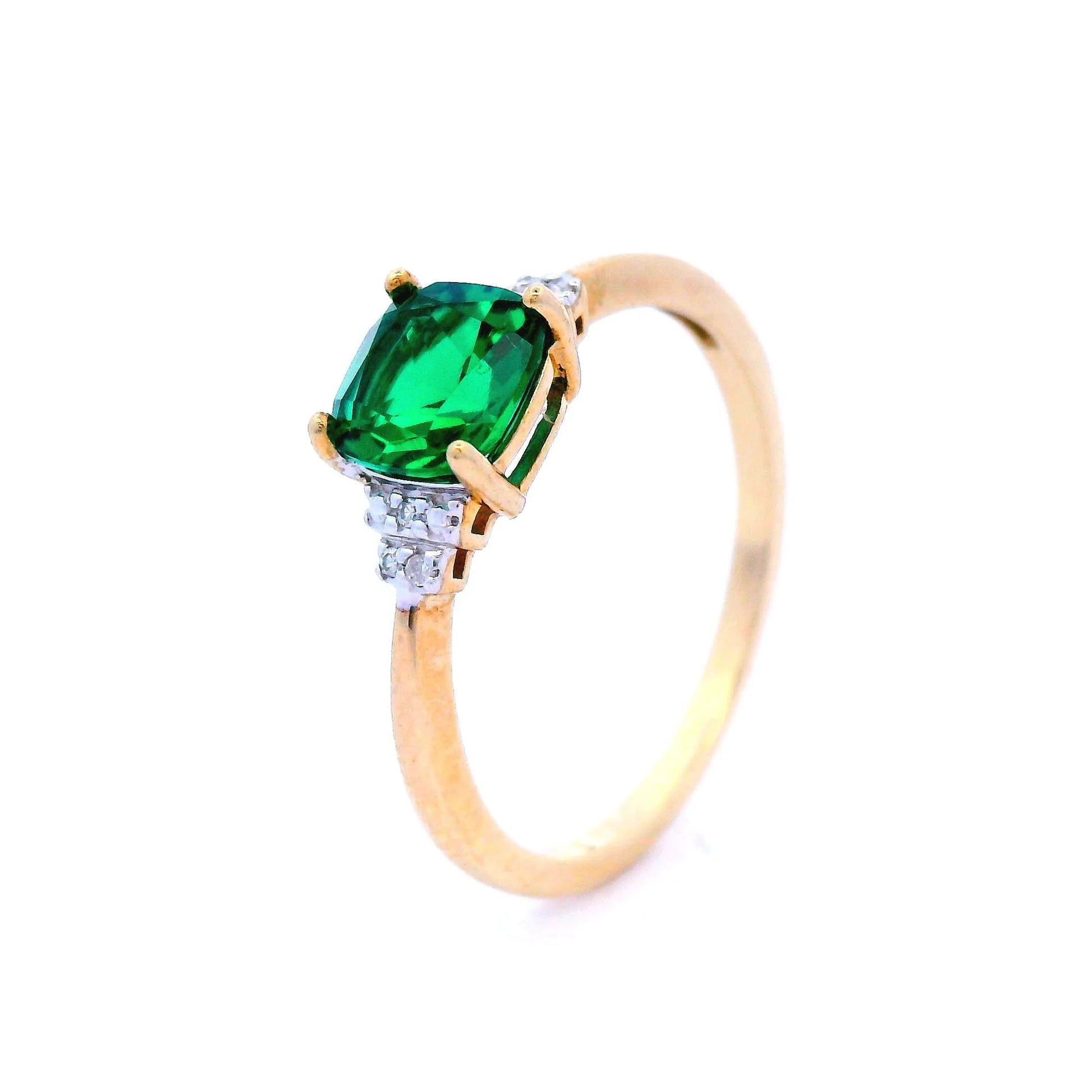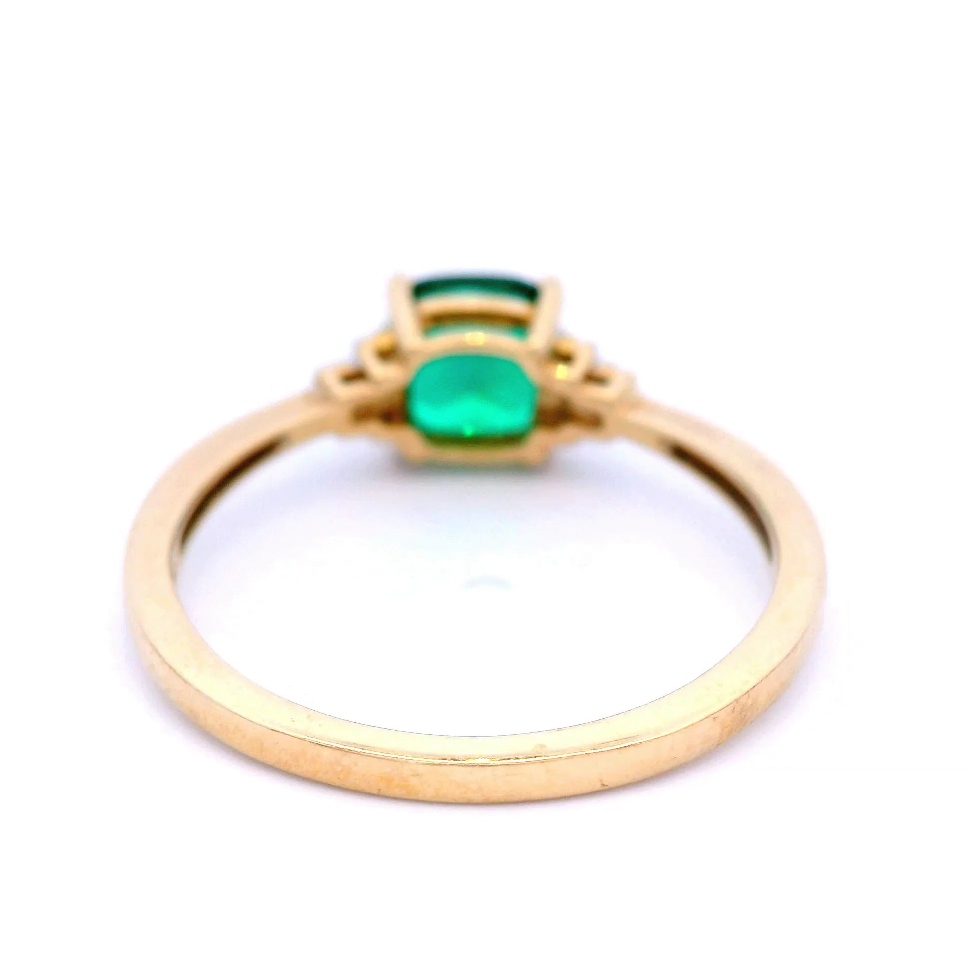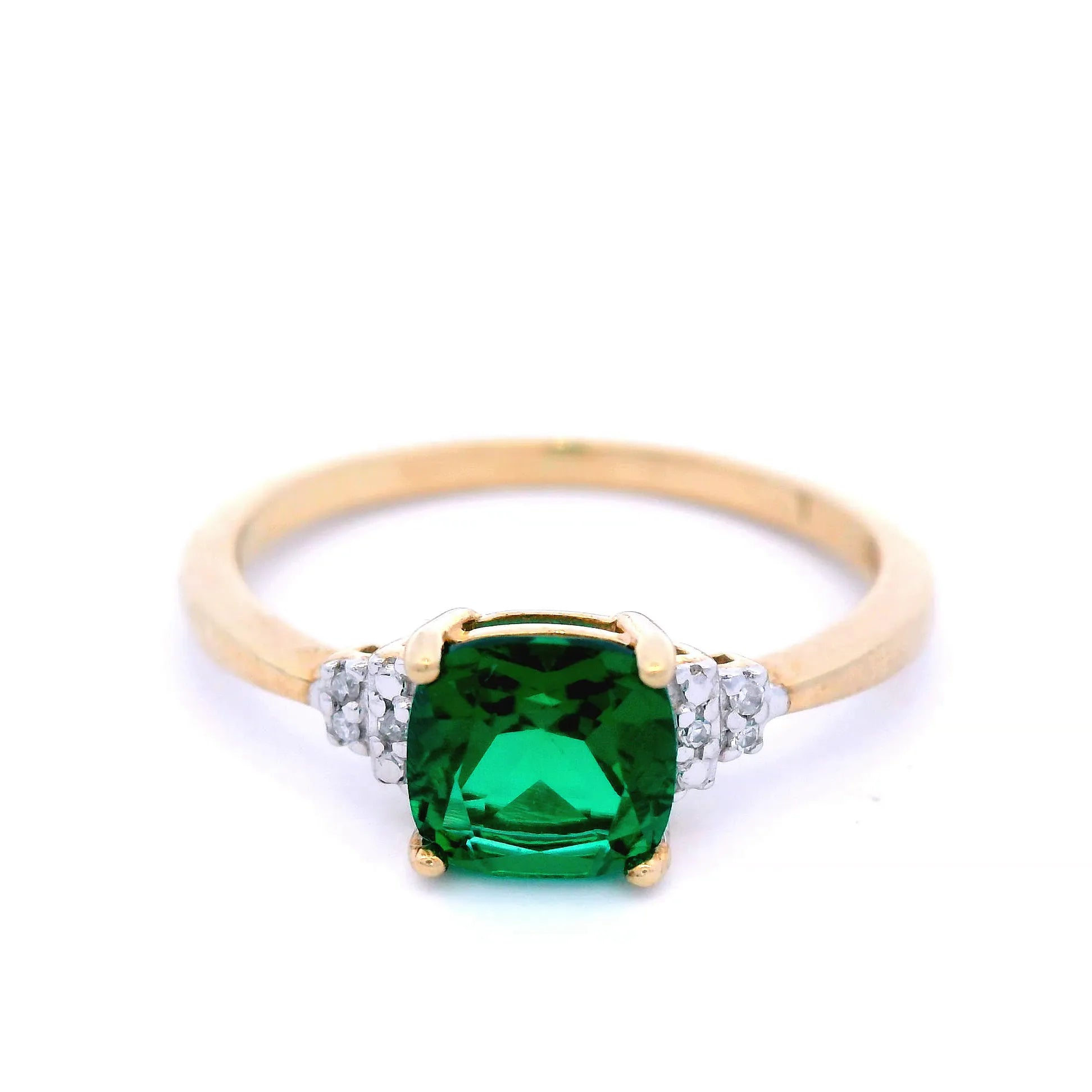 Cushion Cut Emerald & Diamond Dress Ring. Set in 9 Carat Yellow Gold with a Cushion Cut Created Emerald and Diamonds