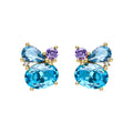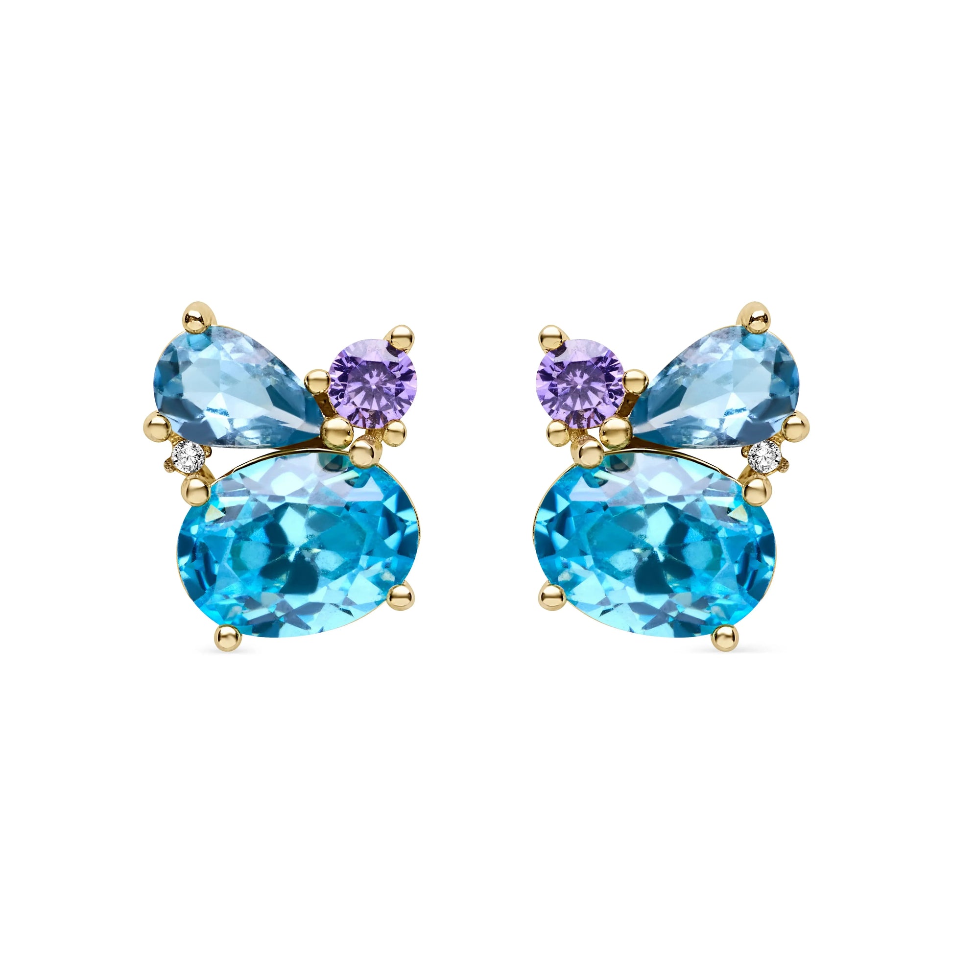 Make a statement with these luxurious gold-plated earrings that capture attention from every angle. Each earring features a carefully curated collection of premium gemstones: brilliant cubic zirconia for maximum sparkle, rich purple amethyst for royal elegance, and two mesmerizing London Blue Topaz stones that steal the show with their deep, oceanic hue.