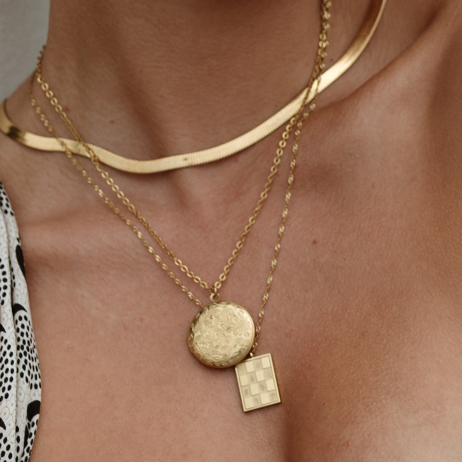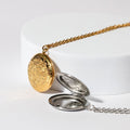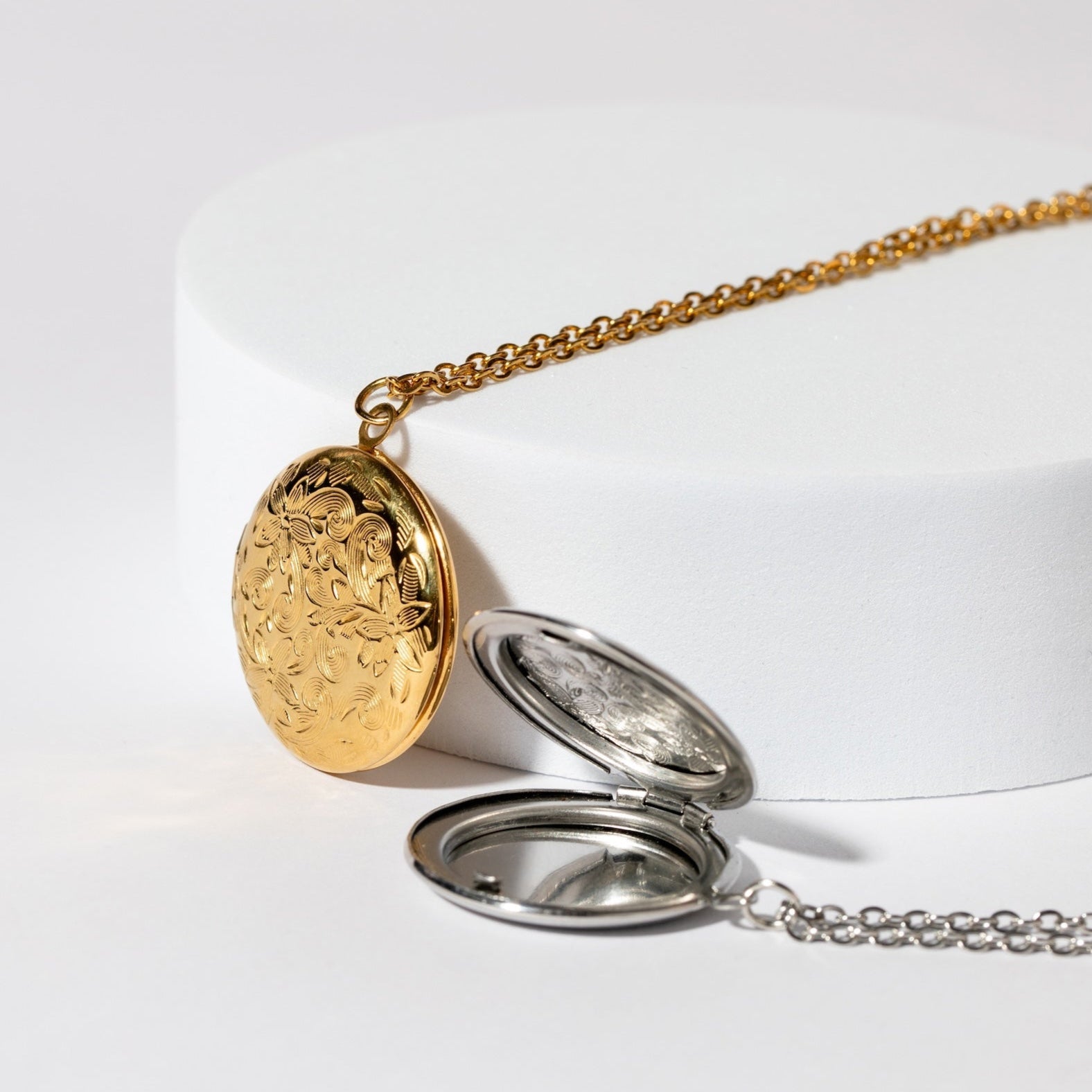 The length of the chain is 18 inches (just under 46 cm's) with a free 2 inch extender already attached so you can wear at multiple lengths to suit your mood. The gorgeous locket etched with Broderie Anglaise style markings, measures 3.1cm's x 2.6cm's. It is a functional locket that opens and closes, so that you may keep a locket of hair, an image or other special keepsake. It has been laser engraved and polished by hand. This pieces weighs 7 grams in total, making it comfortable to wear all day, every day. 18K Genuine Gold coated that is permanent due to our innovative and unique manufacturing. Waterproof, tarnish proof, forever jewellery. Luxury for less for you or your loved one. Also available in Silver.Â