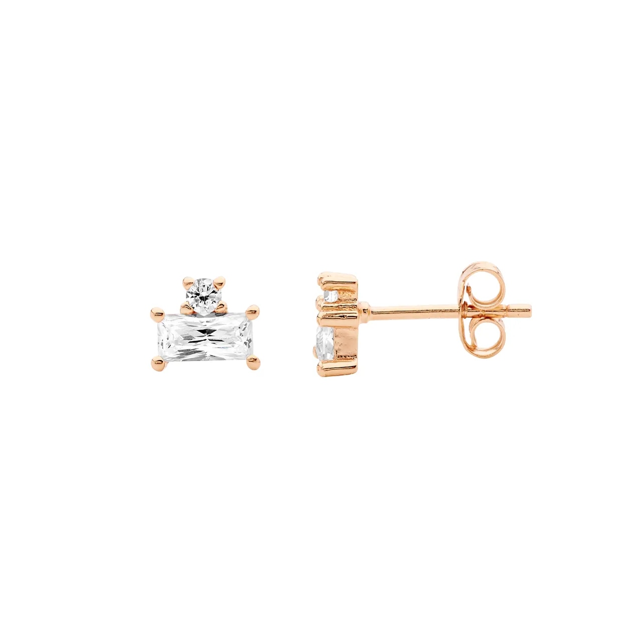 Ellani Baguette and Round Cubic Zirconia Stud Earrings in Rose Gold plated Sterling Silver