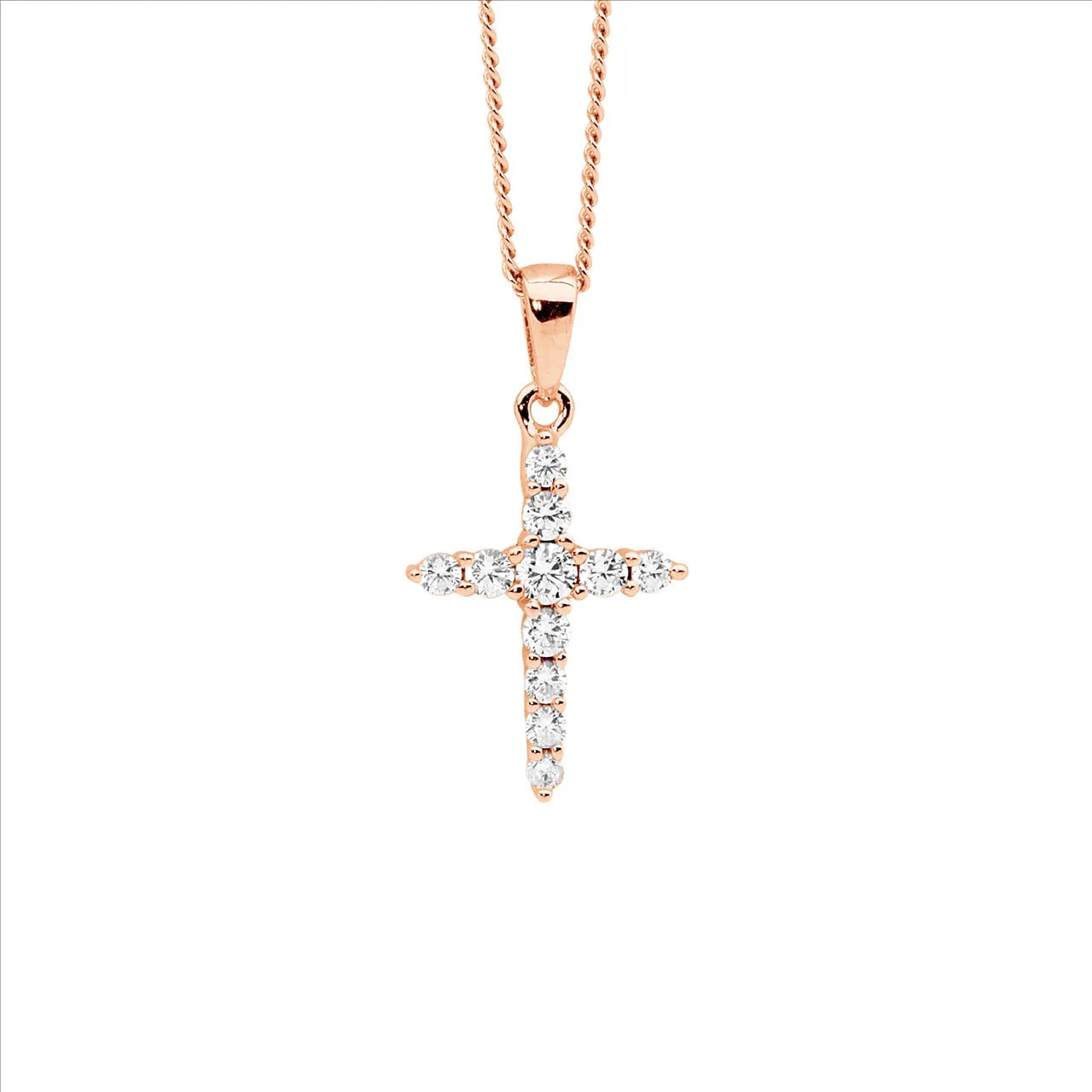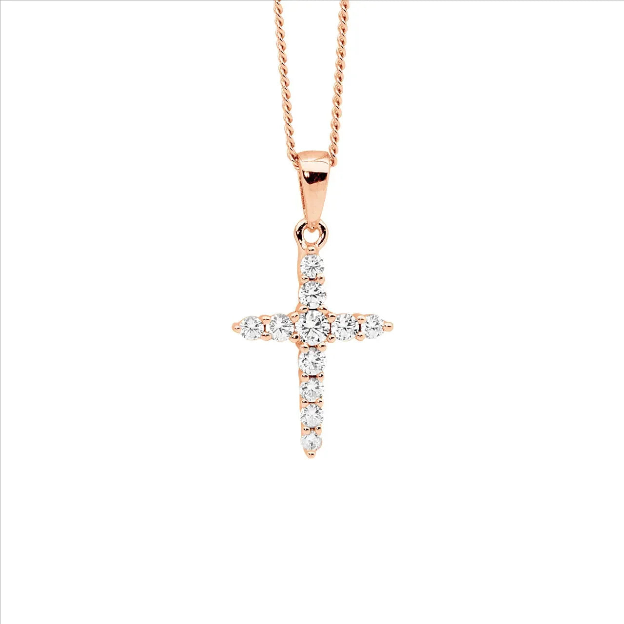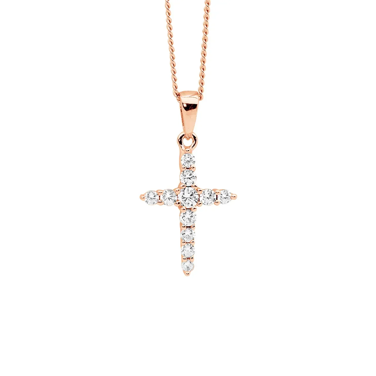 Ellani Rose Gold Plated Cross Pendant - Sterling Silver Cubic Zirconia