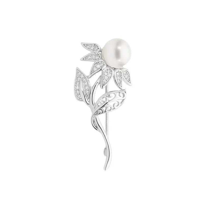 Ellani SS WH CZ Flower Brooch w/ Freshwater Pearl