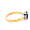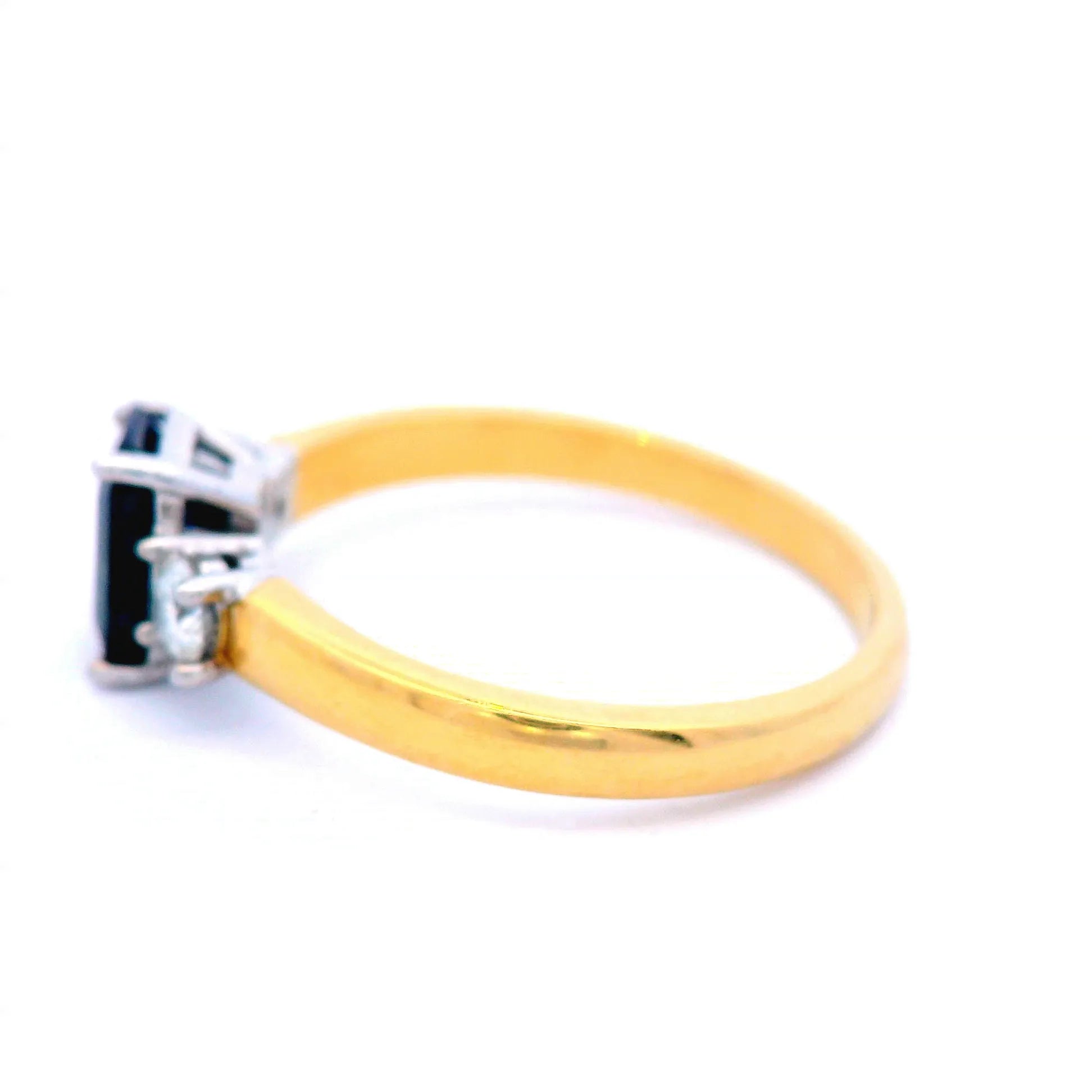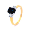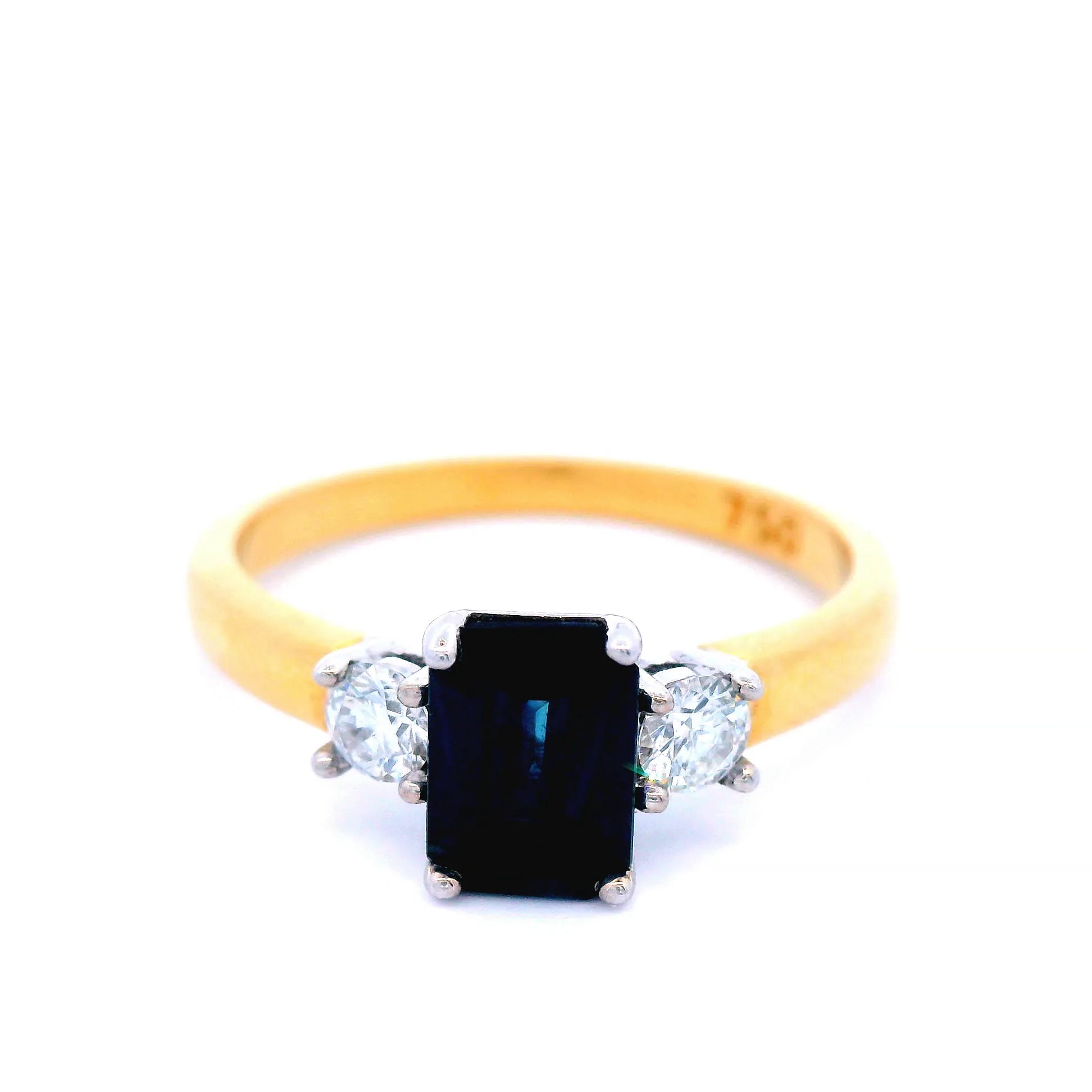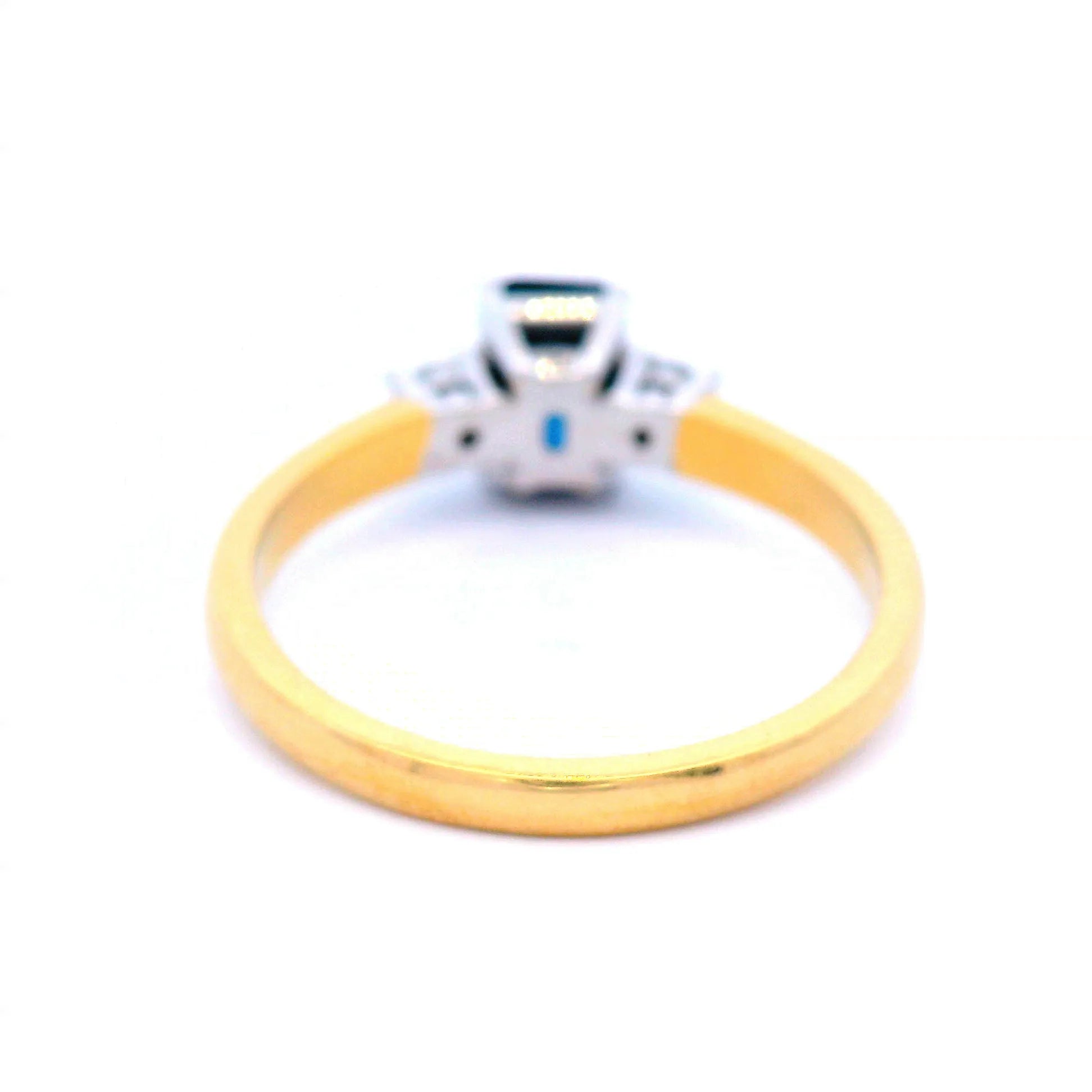 Emerald Cut Sapphire and Diamond Ring, featuring a 7mm x 5mm Emerald Cut Sapphire with 2 x 0.10 Carat Round Brilliant Cut Diamonds set either side in a 18 Carat White Gold basket setting, set upon an 18 Carat Yellow Gold Band. Total Weight; 3.4 Grams