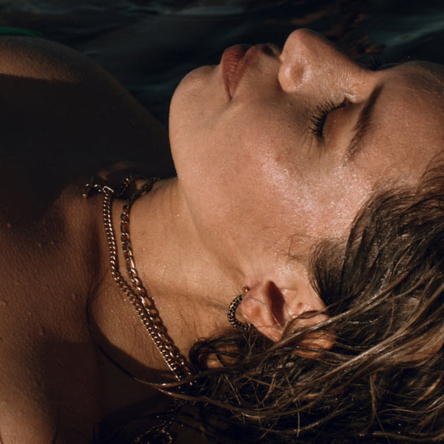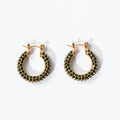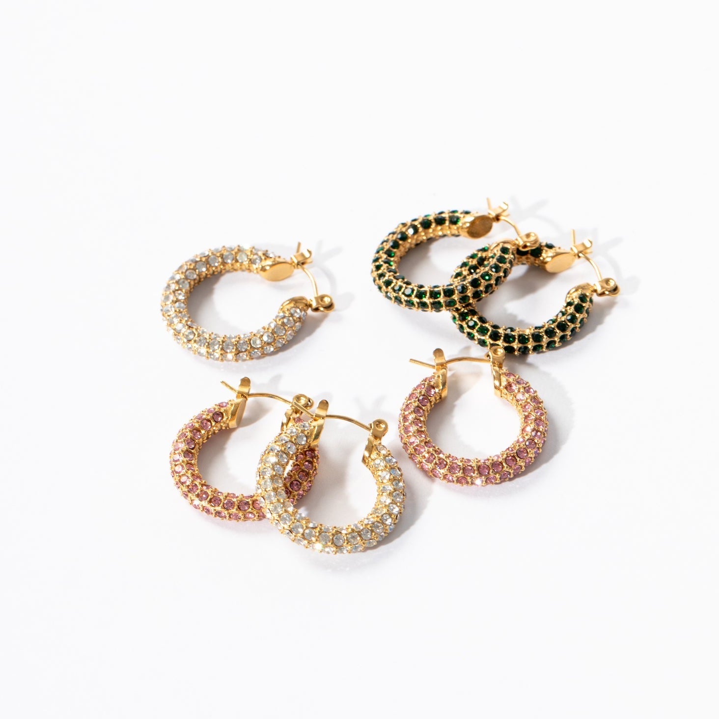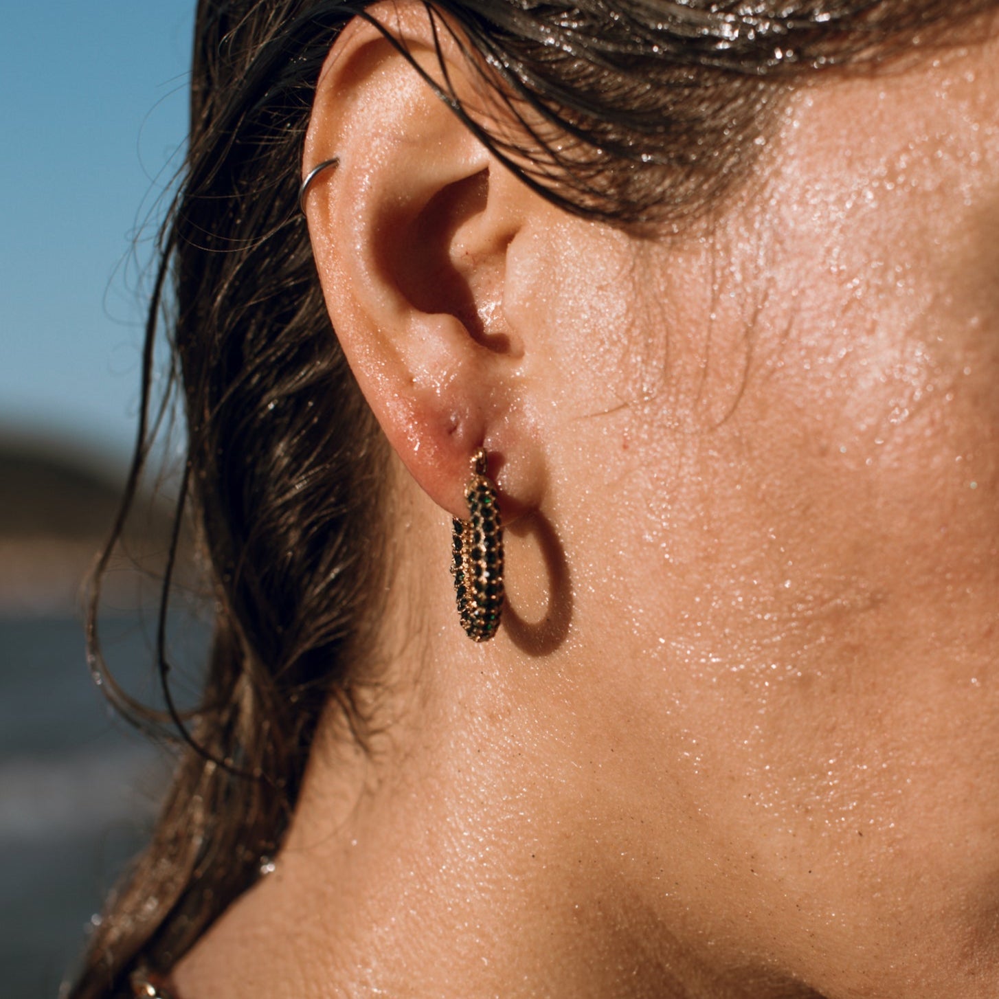 Gold huggies with multiple reflective pave set emerald coloured gems. Mysterious, beautiful and durable. Set in permanent 18k gold coating. Made to wear day and night without ever tarnishing or fading. Allergy Safe and Nickel free. Available in Emerald, Snow and Blush.