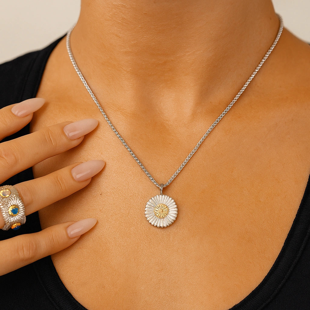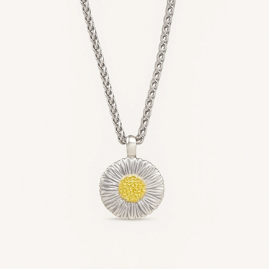 This silver-plated necklace features a delicate daisy pendant with a vibrant yellow centre, perfect for adding a subtle touch of nature to any outfit. The flower design is finely crafted to capture the elegance of a daisy, making it an ideal accessory for any occasion.