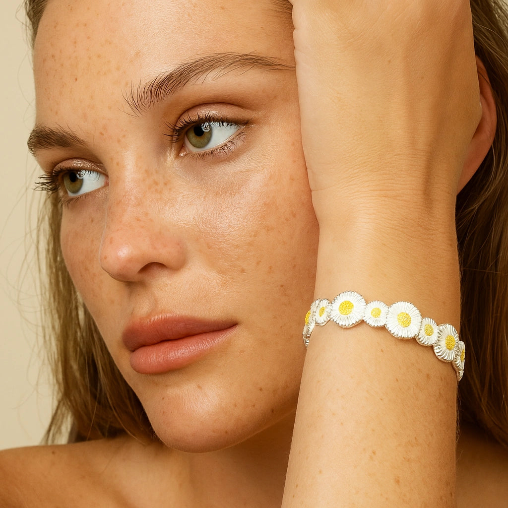This charming floral daisy bracelet features intricate flower designs with a vibrant golden centre, all plated in silver for a sleek and elegant finish. The delicate flowers are linked together to create a beautiful piece, perfect for adding a touch of nature-inspired elegance to your wrist. Ideal for both casual and formal wear, this bracelet is a timeless accessory that complements any outfit.