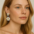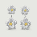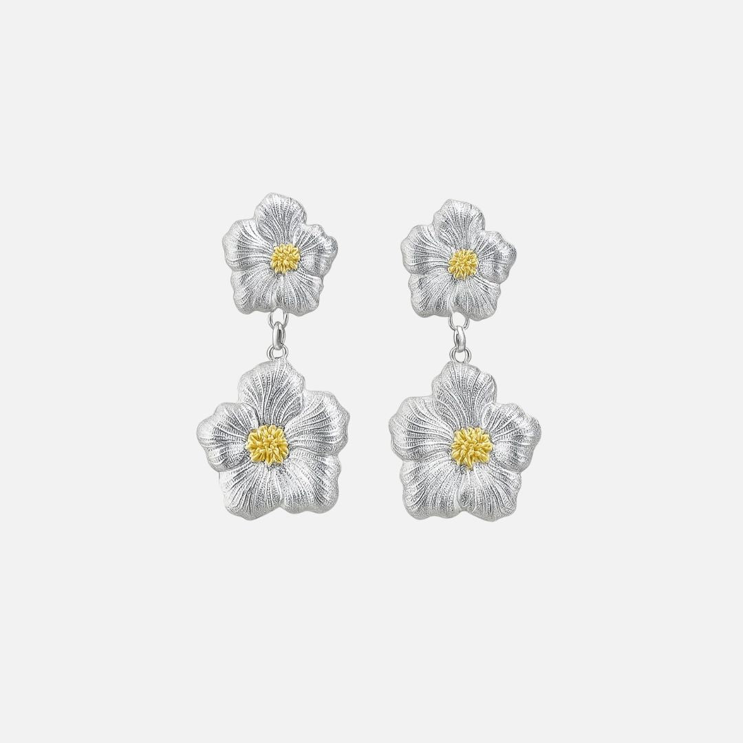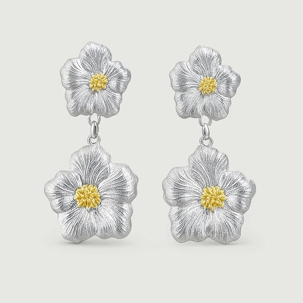 These elegant floral drop earrings feature a beautiful design with intricate detailing, complemented by a stunning gold accent at the centre of each flower. Crafted with precision, these earrings offer a perfect blend of silver and gold, making them an ideal accessory for both casual and formal occasions. The graceful drop design adds a touch of sophistication and charm to your look.