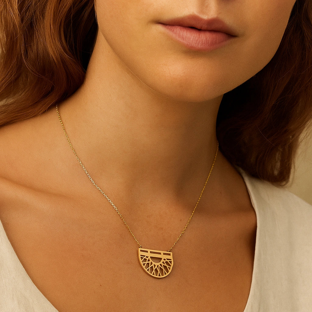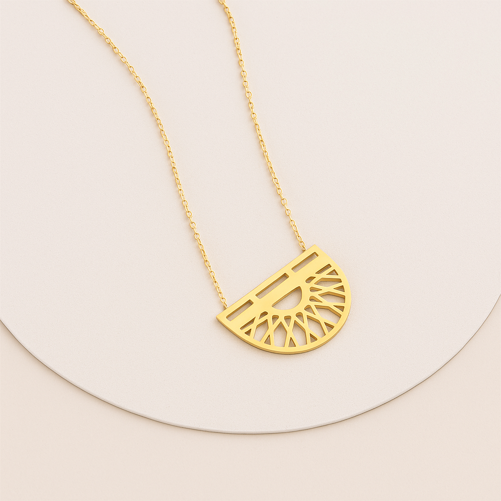 This striking necklace is crafted from durable stainless steel, featuring a modern geometric sunrise design in a half-circle pendant. Suspended from a sleek link chain, this piece combines elegance with contemporary style, making it perfect for both everyday wear and special occasions. Its intricate cut-out detailing adds a unique touch, while the lightweight material ensures comfort throughout the day. An ideal gift or a stylish addition to your jewellery collection.