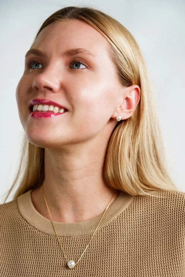 Crafted from 18k gold e-coated 925 sterling silver, each piece cradles a radiant 7mm pearl within a graceful crescent-shaped frame — designed to offer both beauty and comfort.