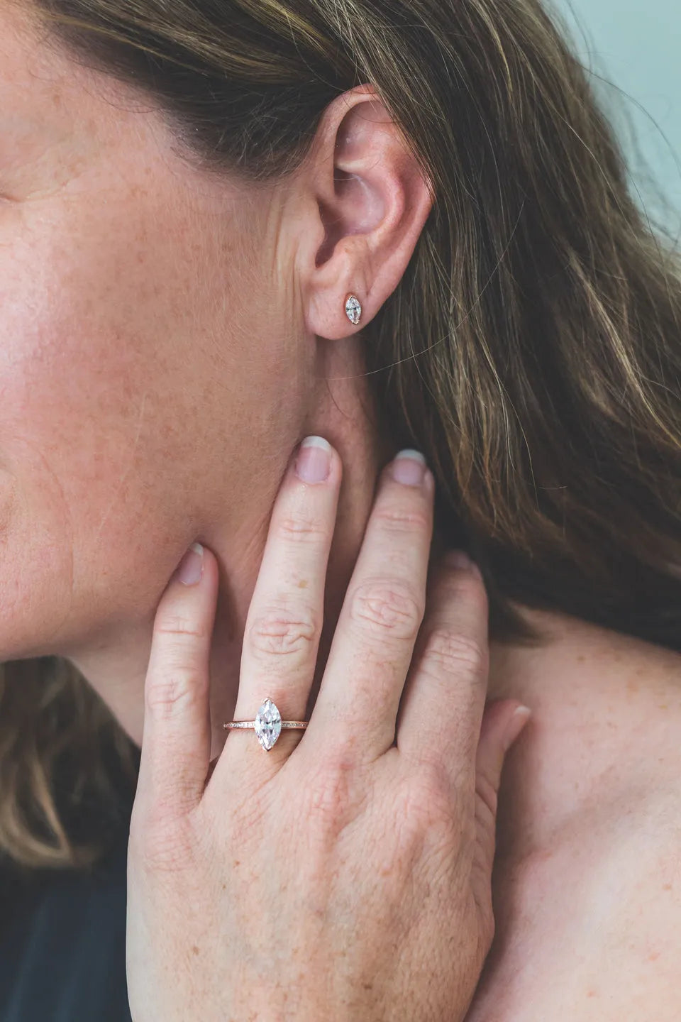 Elegant and refined, the Forever Earrings feature a beautifully cut marquise stone set in a delicate V-prong setting. Their timeless silhouette pairs effortlessly with the matching Forever pendant and ring or complements other marquise styles in the Heirloom collection - perfect for stacking across multiple piercings.