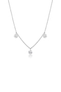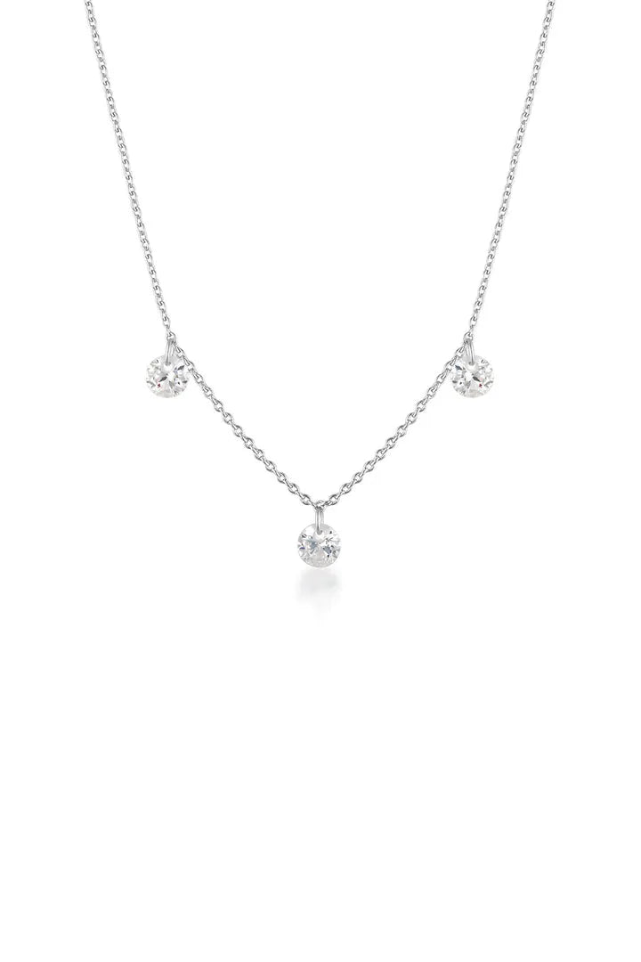 The necklace features three floating cubic zirconia suspended on the rhodium-plated 925 sterling silver chain, mirroring the design language found in the earrings of the collection. The rhodium