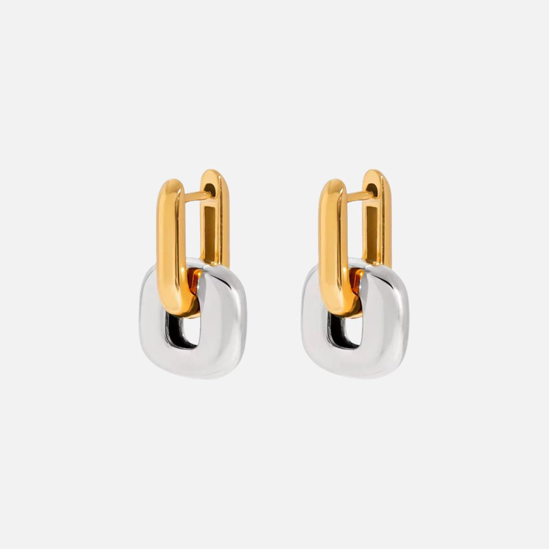 These stunning drop earrings feature a sleek and modern design with interlocking link elements in gold and silver plating. Crafted from high-quality stainless steel, they are both waterproof and hypoallergenic, making them a durable and stylish choice for everyday wear. The minimalist yet bold design adds a contemporary touch to any outfit, perfect for elevating your look on special occasions or casual outings. These earrings are lightweight and comfortable, offering a secure fit for all-day wear.