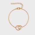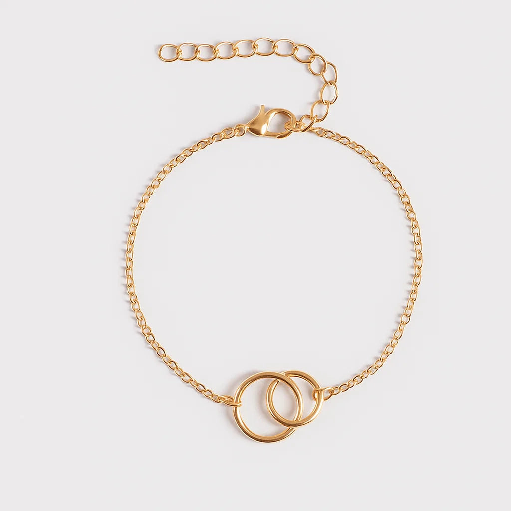 This elegant gold-plated bracelet features a minimalist design with two interlocking rings at the centre, offering a sophisticated yet modern aesthetic. Crafted from high-quality metal, this bracelet is the perfect accessory for any occasion. Whether worn on its own or stacked with other pieces, the simple yet striking double-ring design adds a touch of elegance to your look. The adjustable chain ensures a perfect fit, and its sleek, cold style design complements a variety of fashion trends.