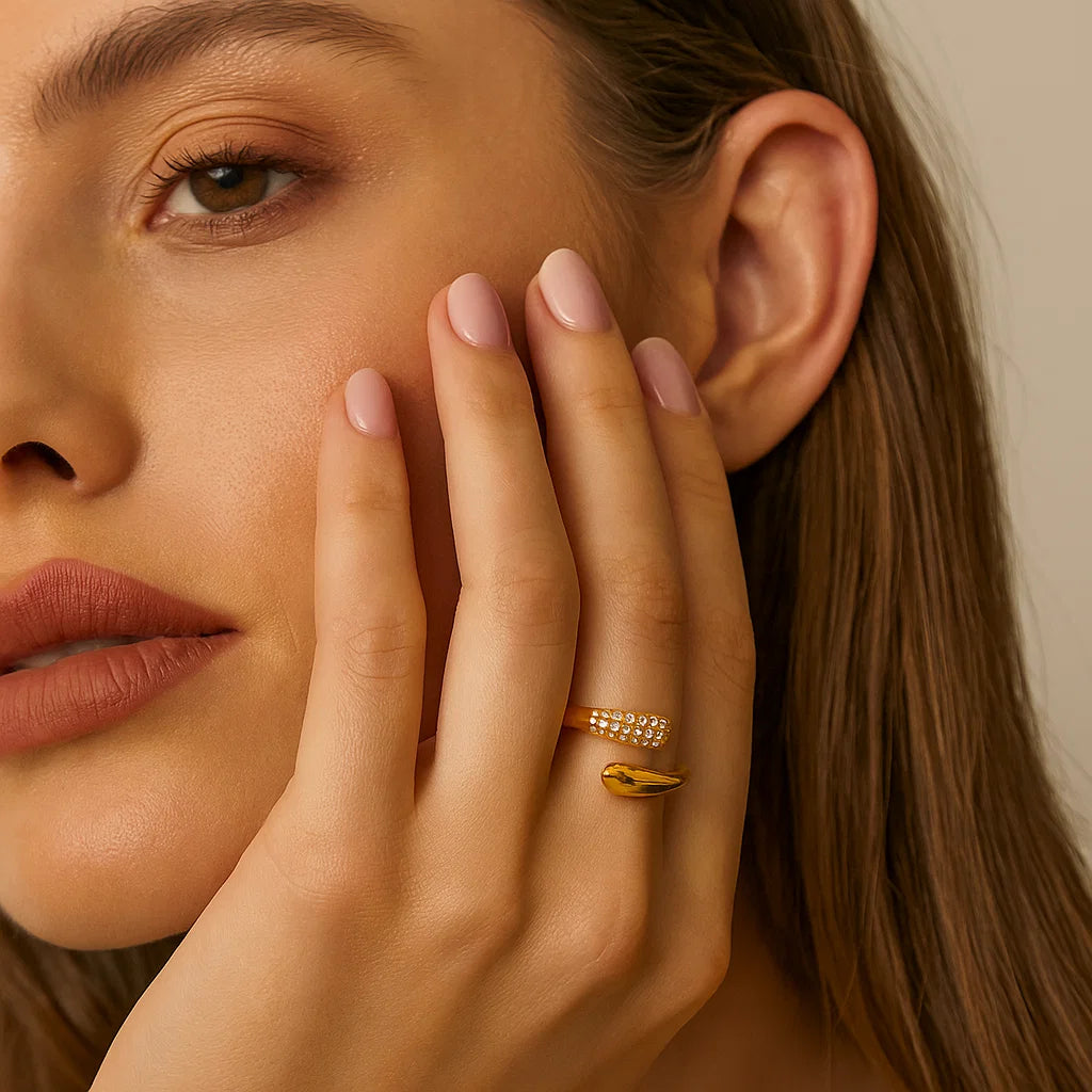 This elegant gold ring features a sleek, open geometric design with a stunning cubic zirconia detail at one end. Crafted from durable stainless steel and plated with a beautiful gold finish, this ring exudes modern sophistication. The cubic zirconia stones add a touch of sparkle, making it perfect for both casual and formal occasions. It offers both comfort and style, and its adjustable fit ensures versatility.
