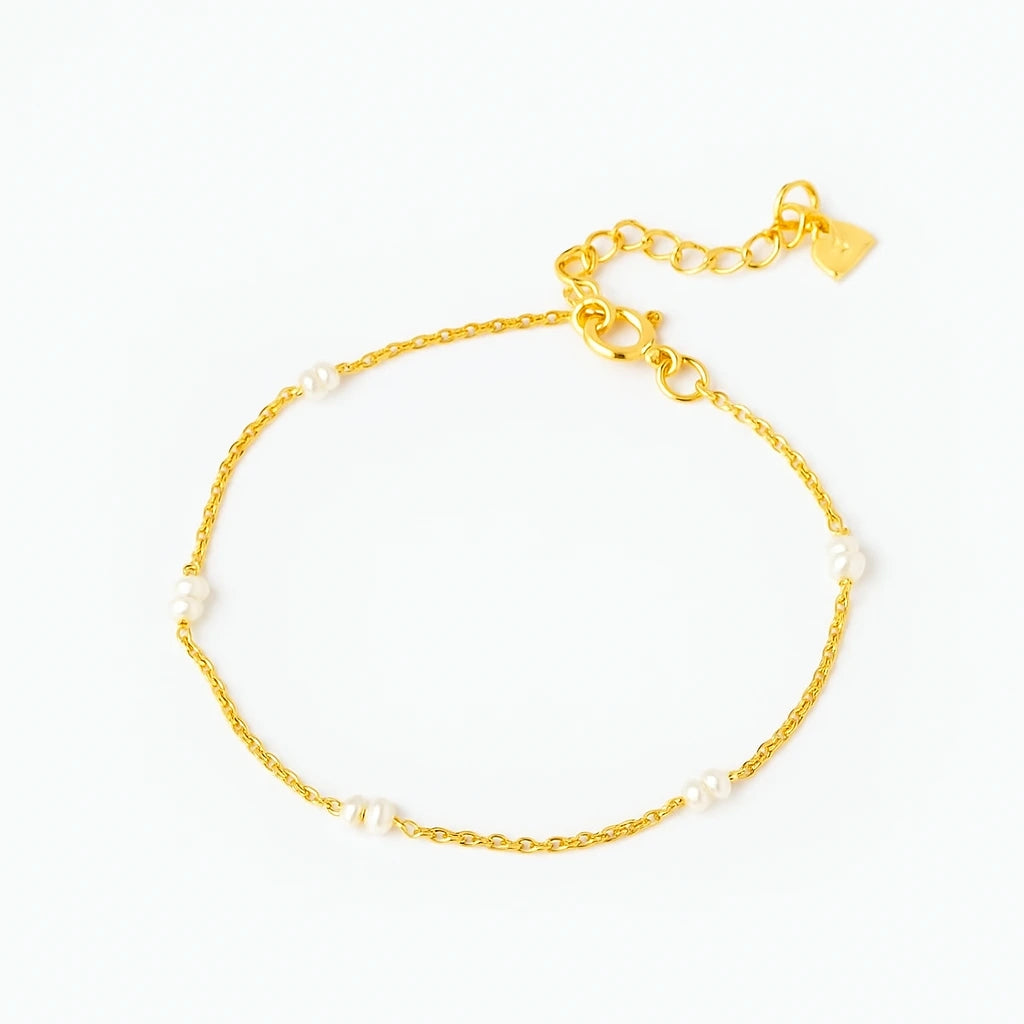 Add a delicate touch of elegance to your wrist with this beautiful gold-plated pearl bracelet. Designed with subtle freshwater pearls evenly spaced along a fine gold-plated chain, this bracelet offers timeless sophistication. Its adjustable length ensures a perfect fit, making it an ideal accessory for both everyday wear and special occasions. The minimalist design adds just the right amount of sparkle, complementing any outfit with its understated charm. Whether you're treating yourself or gifting someone special, this bracelet is a refined addition to any jewellery collection.