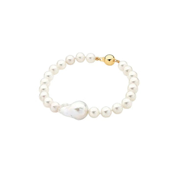 Enhance your personal style with our exquisite Gwendolyn Bracelet, a perfect blend of individuality and timeless elegance. This bracelet boasts a strand of round freshwater pearls, highlighted by a generously sized Baroque pearl at its centre, all elegantly fastened with a 9ct ball clasp for easy wearing. Suitable for any event, it radiates understated sophistication and beautifully highlights your distinctive fashion sense.