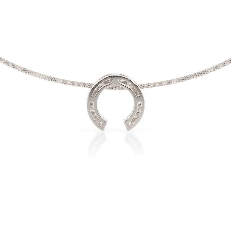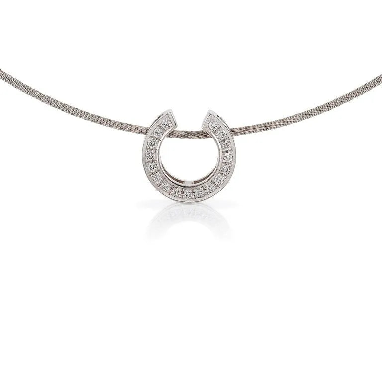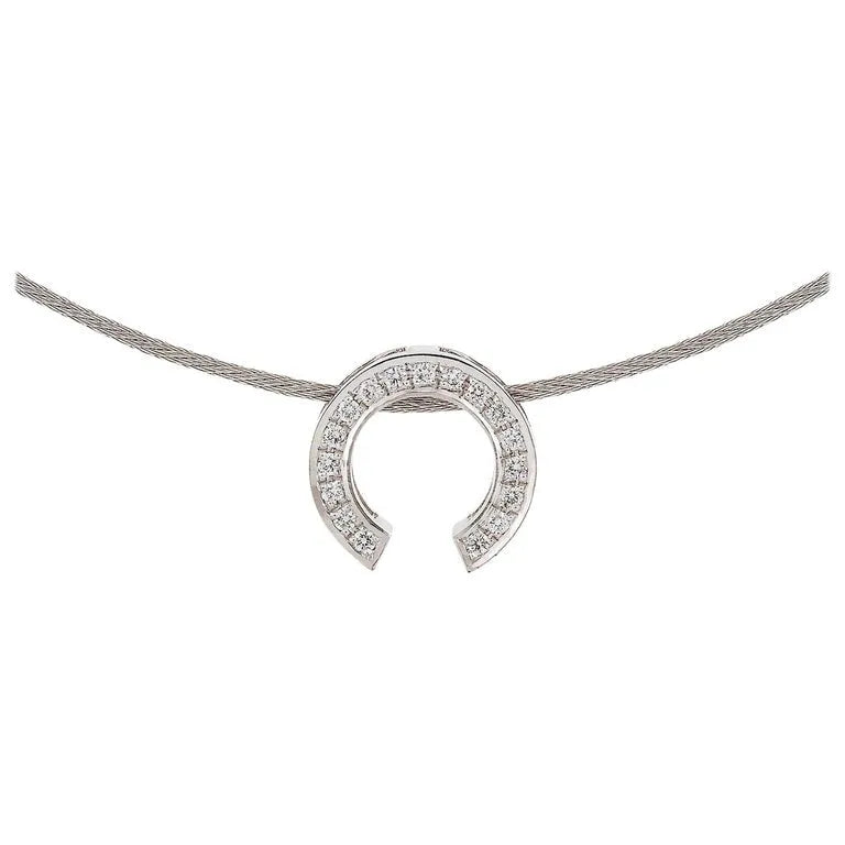 This gorgeous petite pendant features a stunning white diamonds. The circular setting is suspended from an elegant 18 carat white gold cable chain.