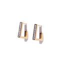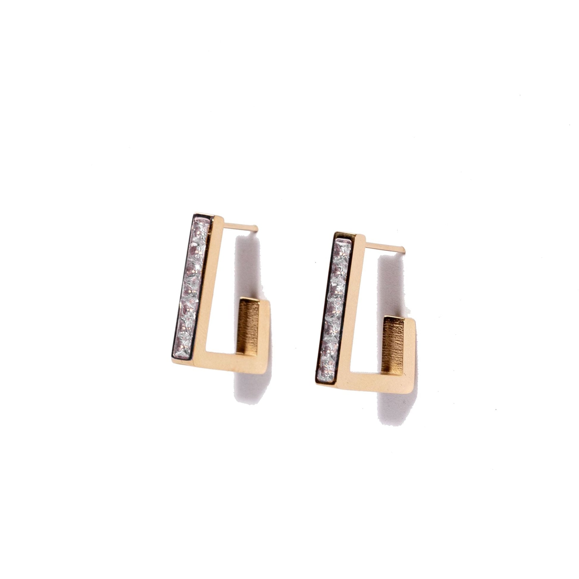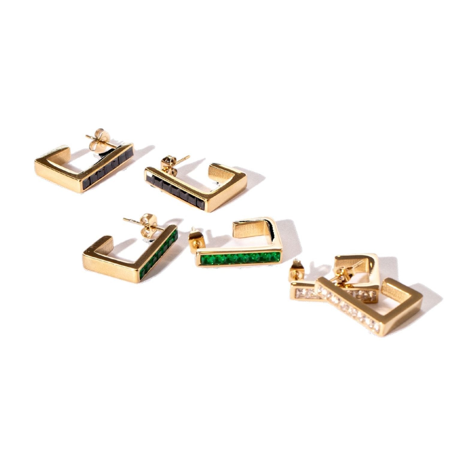 2cm from top to bottom in laid with high quality gemstones that are 3mm wide, channel set and reflect the light with a glamorous shimmer. Set in 18k Gold Permanent coating. Waterproof, Tarnish Proof and Allergy Safe. The return is 8mm with a kick up of 4mm, making an open square. Post and stud clasp for comfortable secure all day or all night wear. Available in Caviar Black, Envy Emerald Green and Ice White.