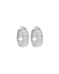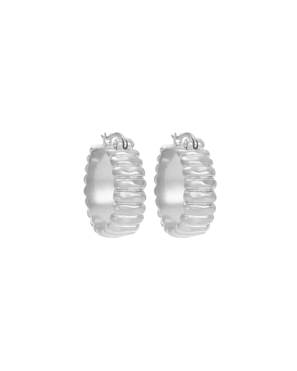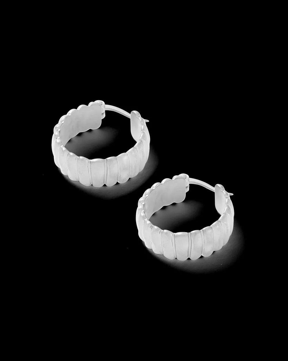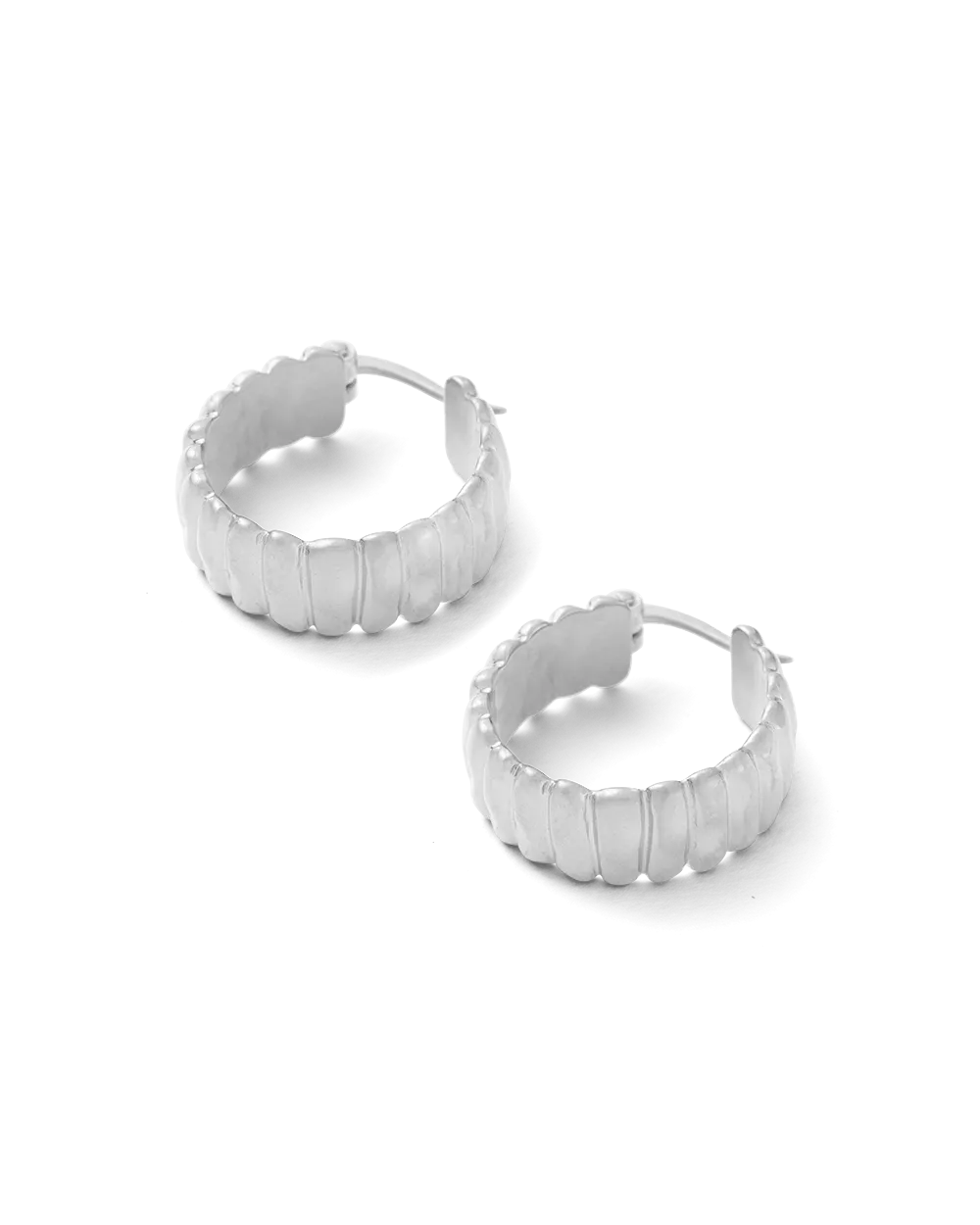 Structured lines meet organic forms. The Cisco Hoops reflect the gentle play between light and shadow, creating a dappled, light-refracting texture. This minimal hoop can be worn alone, or layered to create a bold look