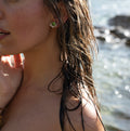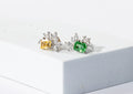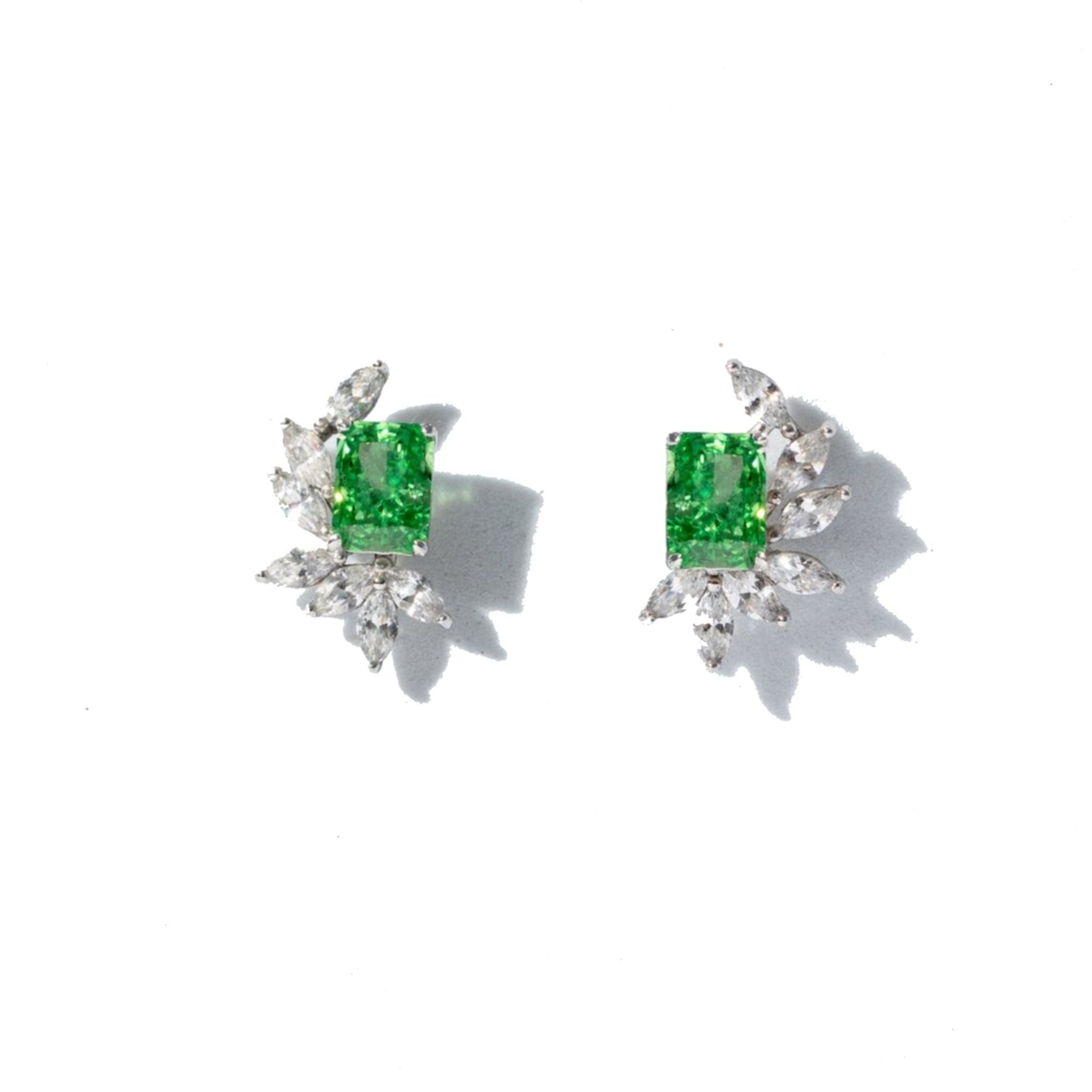 These incredible vintage style studs showcase a 1.25 carat emerald coloured gemstone, surrounded by seven individual claw set, radiant cut white gems.Â