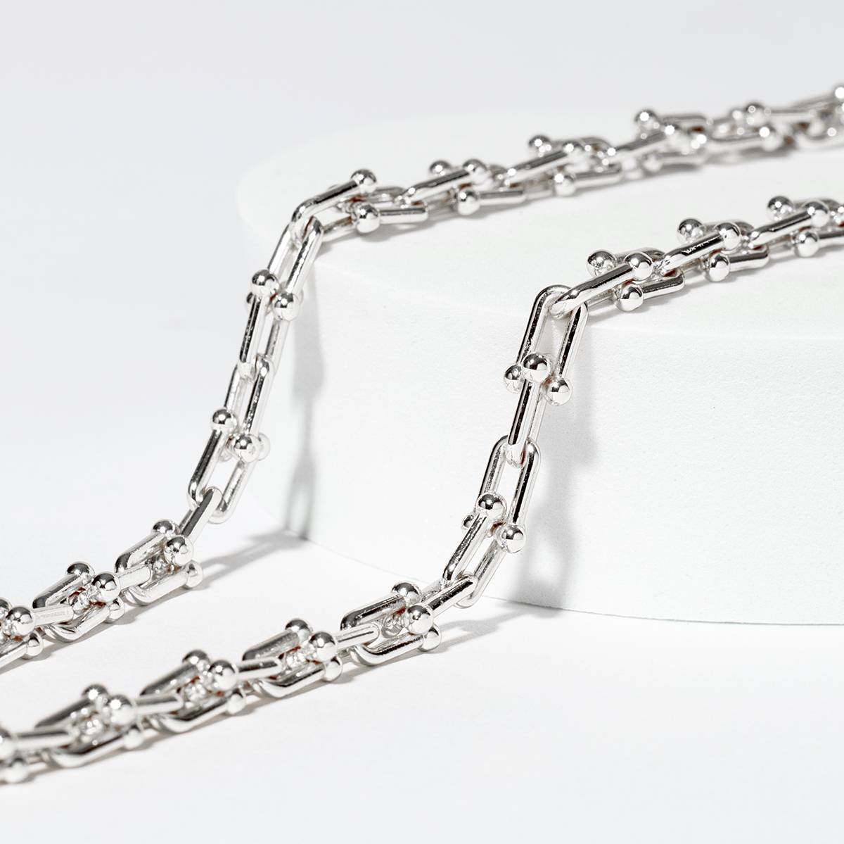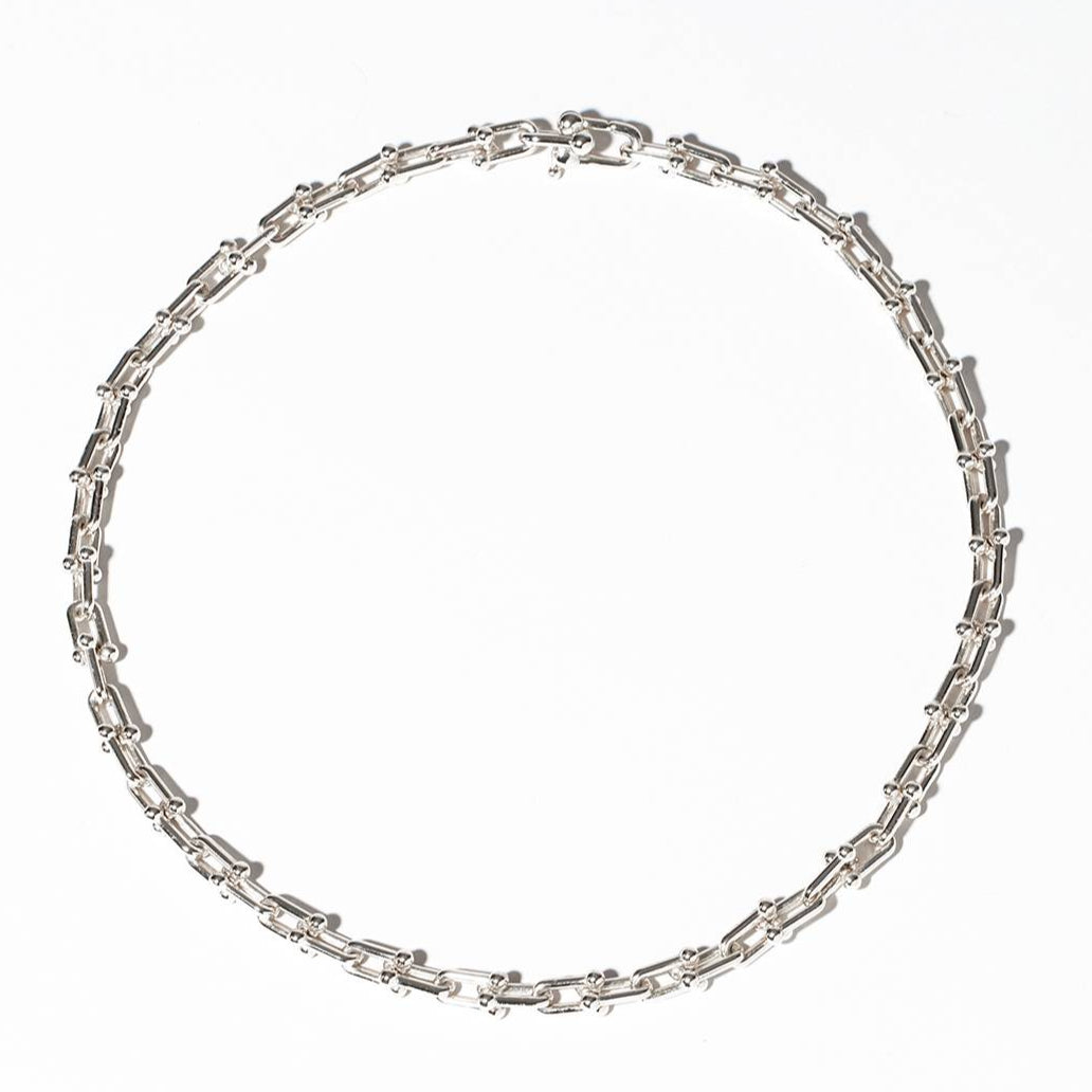 Crafted with 1cm horseshoe-shaped quality pieces and finished with small ball clasps that face each other as they link, this piece stands out as a lasting fashion statement.
