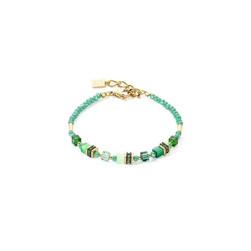Bracelet in a Mini Cube design. Complements the latest fashions perfectly with its trendy green and gold colourway. Handmade in Germany with synthetic tiger's eye, European Crystals, rhinestone rondelles and gold plated stainless steel.