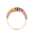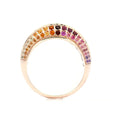 Natural Gemstone and Diamond Dress Ring comprises of various coloured gemstones from vivid Pink Tourmaline, Rhodolite Garnet, Peridot, Citrine and Amethyst. Â Round Brilliant Cut Accent Diamonds adorn the centre of the ring and each stone is meticulously bead set in 9 Carat Rose Gold, in an arch style band.
