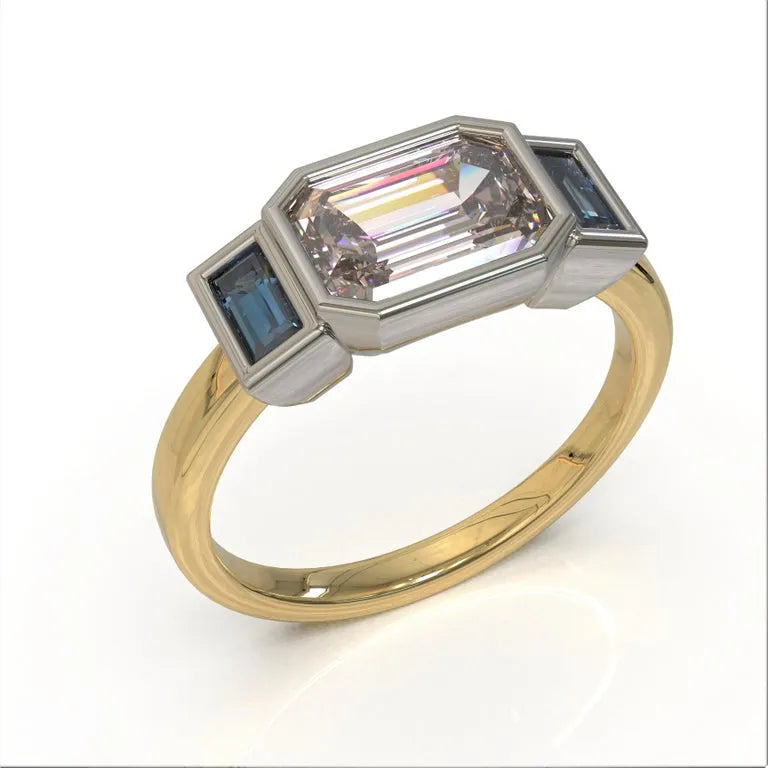 Beautiful and understated, this platinum and 18 carat yellow gold ring is set with an attractive emerald cut untreated peach sapphire with a finest rectangular baguette cut blue sapphire on either side.