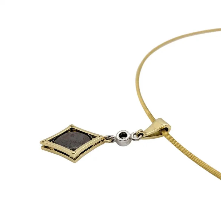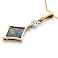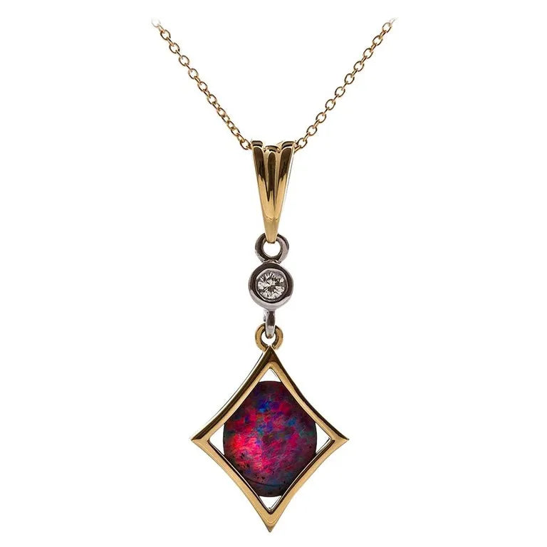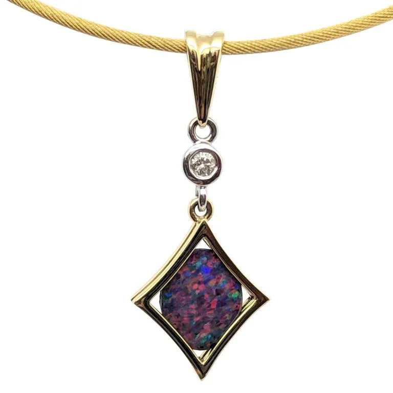 This stunning opal doublet is encased within a lovely 18ct yellow gold diamond-shaped pendant, which is suspended below an 18ct white gold chenier set diamond with fancy triangular bail and 18ct yellow gold trace chain.