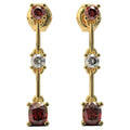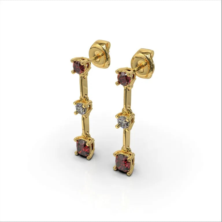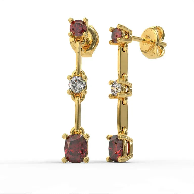 Cushion Cut Red Spinel Round Diamond Dangle Earrings in Yellow Gold