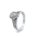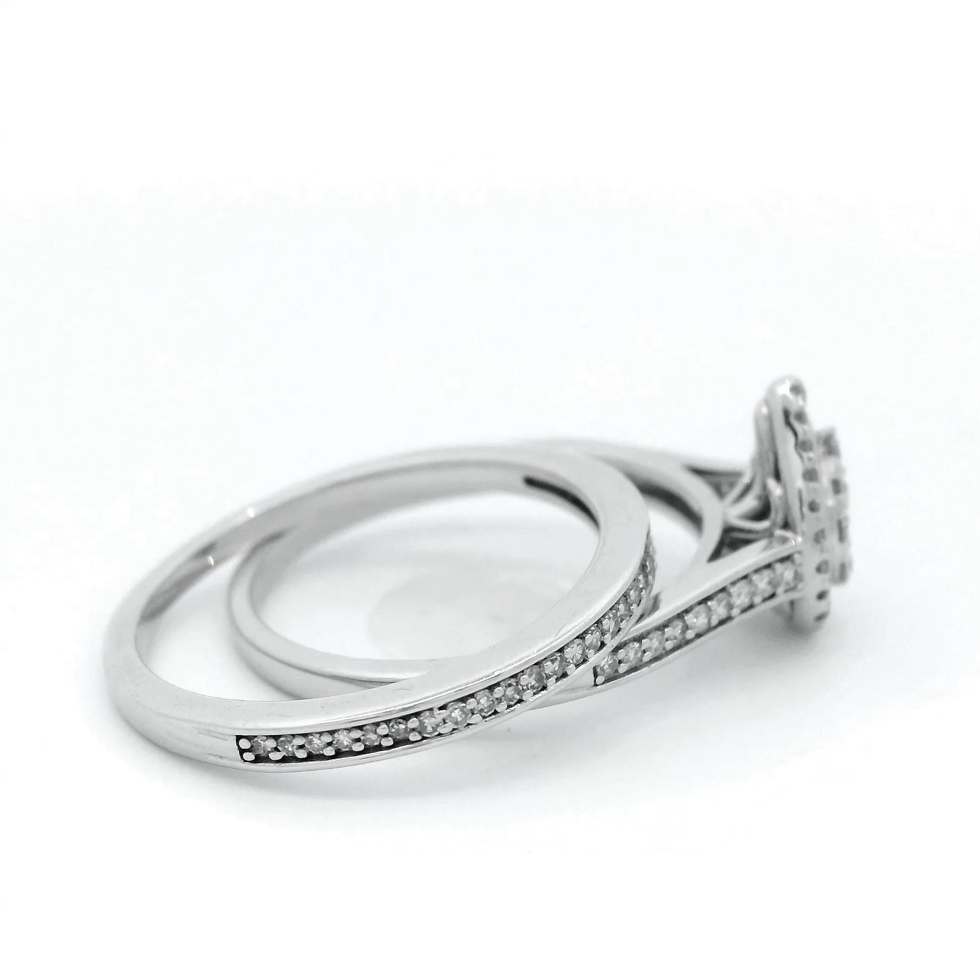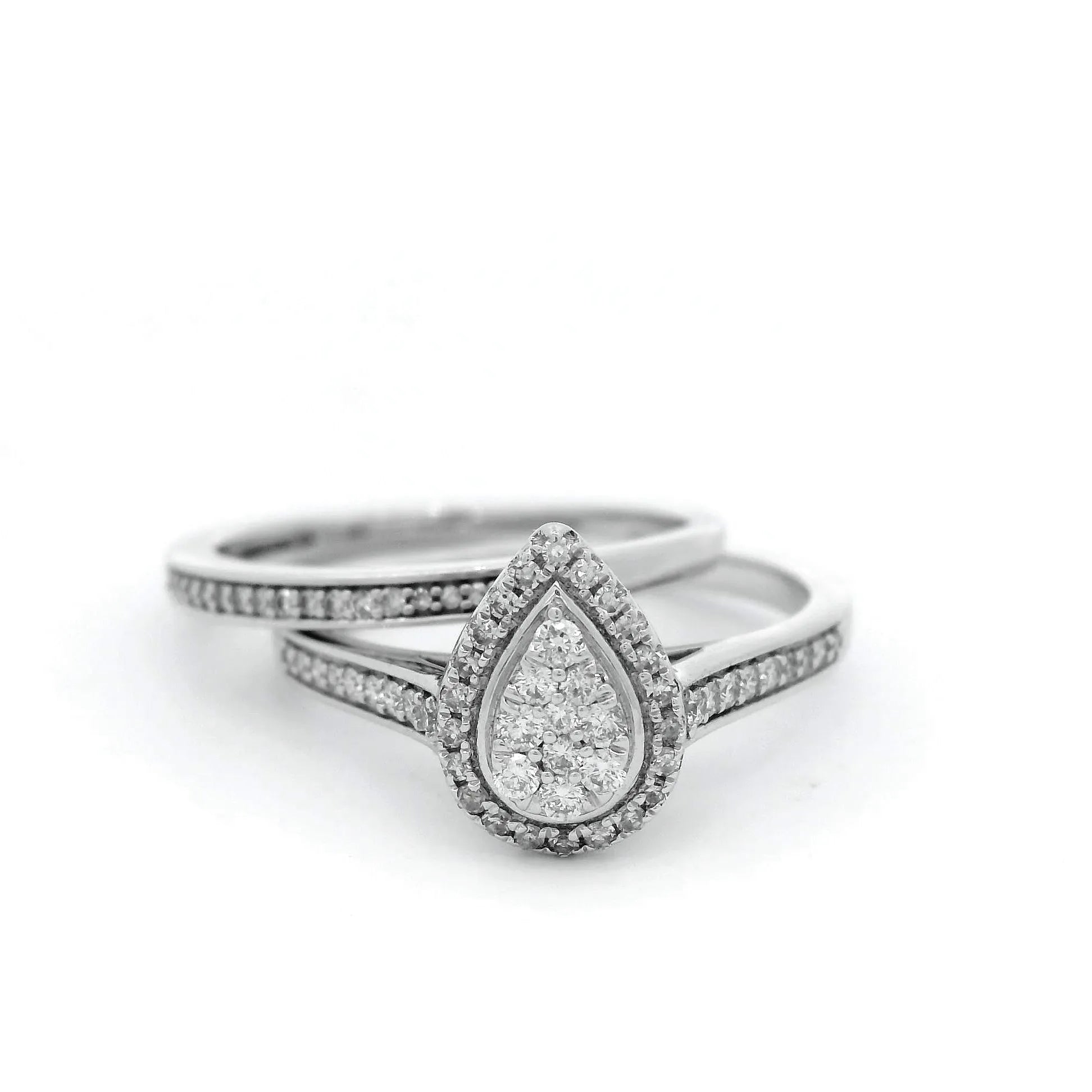 Pear Shape Diamond Engagement & Wedding Ring Set, featuring Round Brilliant Cut Diamonds Bead Set within a White Bezel, and Diamonds Claw Set finishing the Halo.