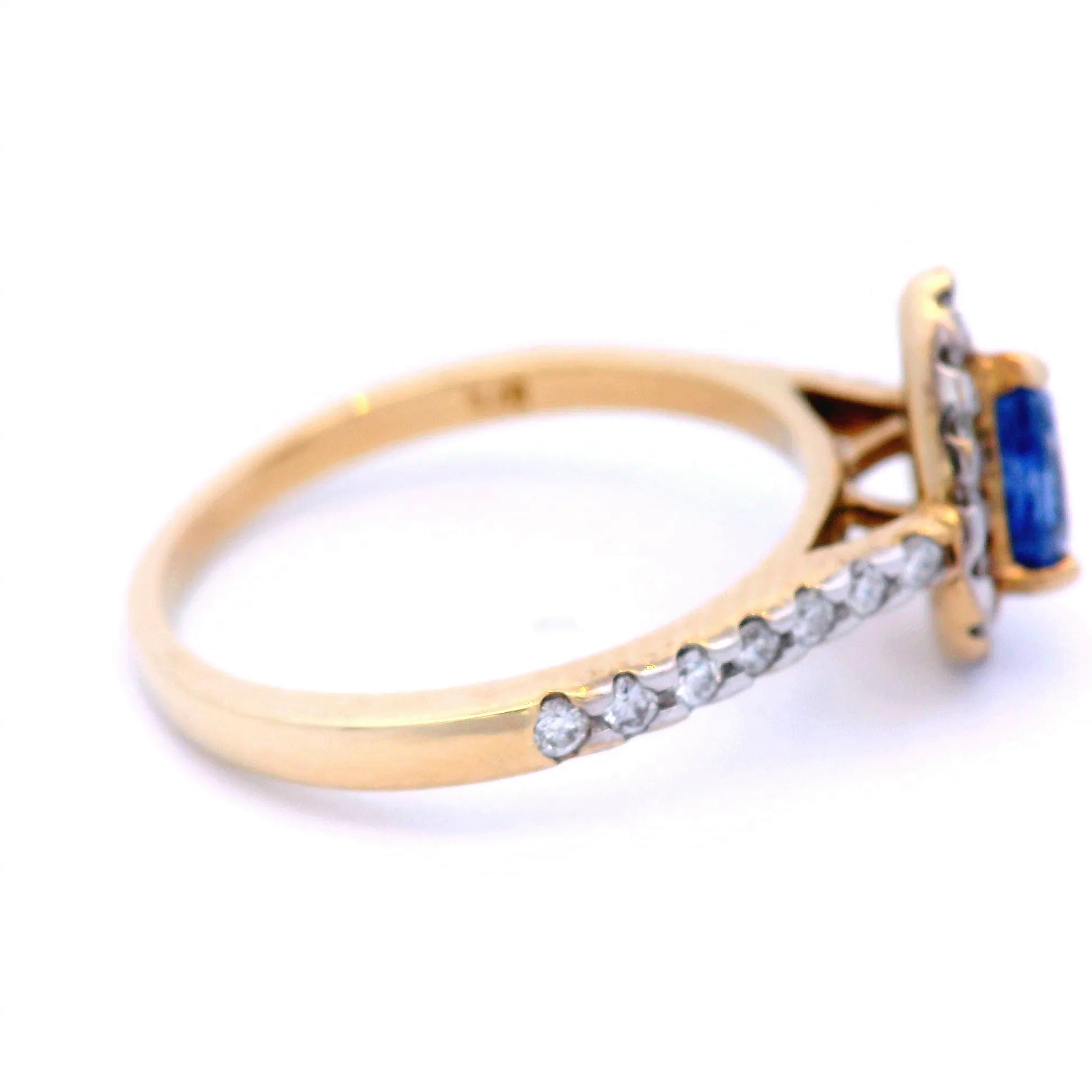 9ct YG PEAR SHAPED CEYLON SAPH SURROUNDED w/HALO SET Dia DRESS RING